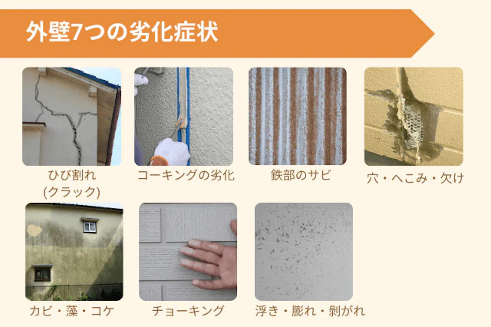 「ひび割れ(クラック)」や「コーキングの劣化」 「チョーキング」など、劣化症状別の補修費用について、こちらで解説しています。