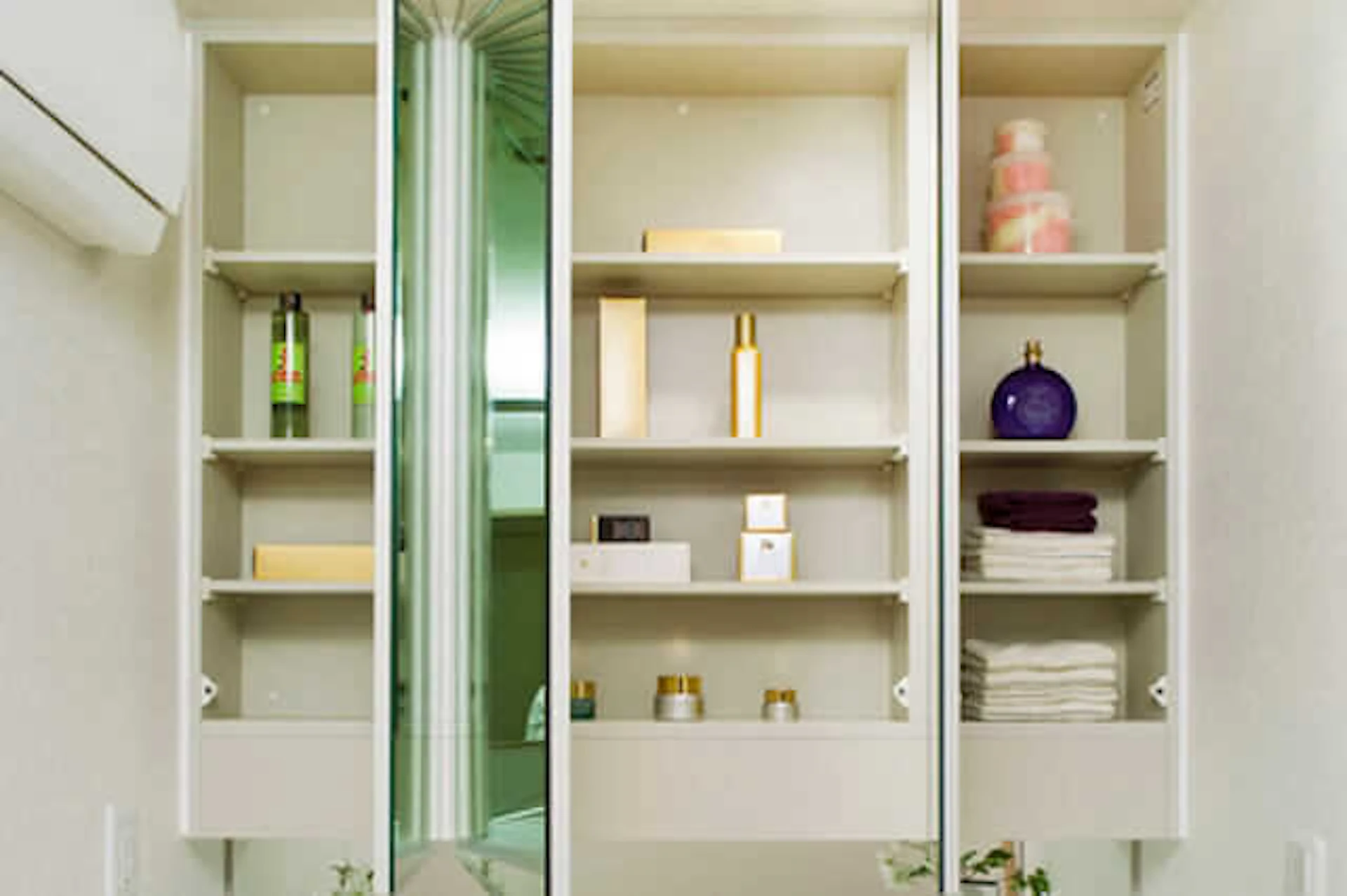 ドライヤーなどの大きめの家電も、3面鏡の内側に収納できます。
