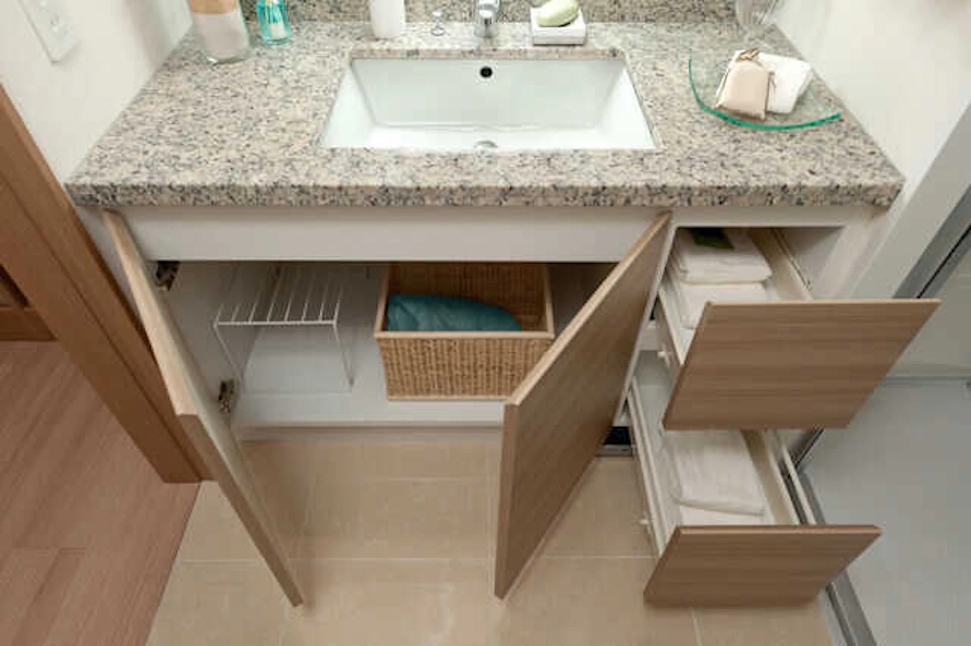 そのため、洗面台のカウンター下に使い勝手のよい収納棚を設置しました。