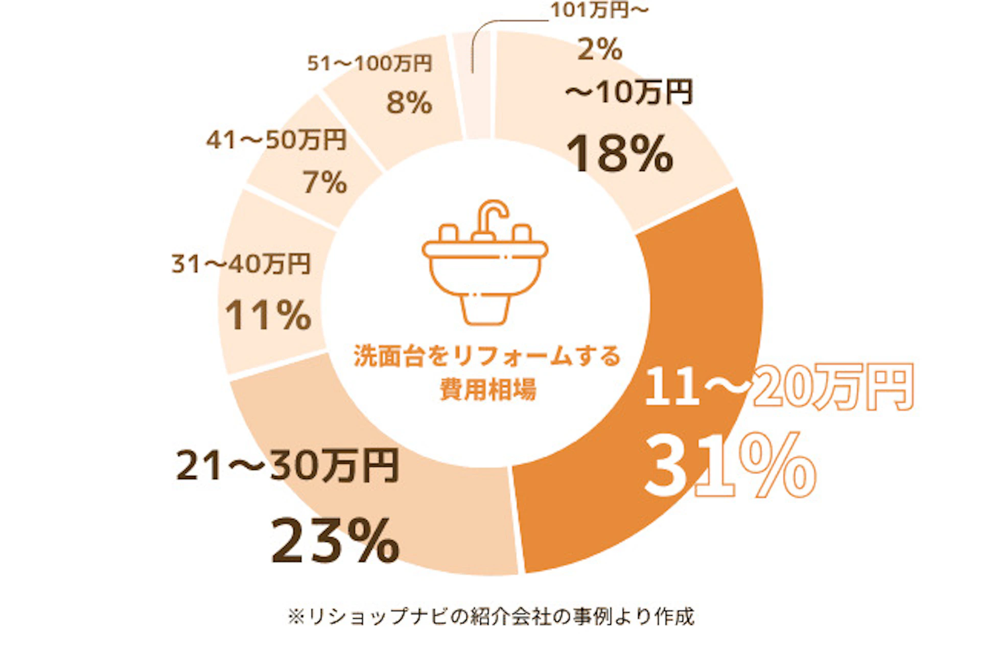 洗面台交換や洗面脱衣所のリフォームにかかる費用の分布は、以下のグラフの通りです。