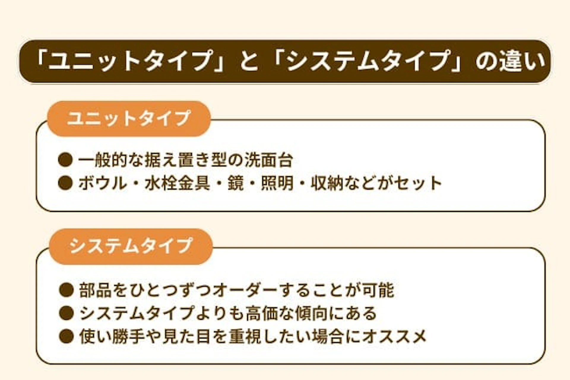 なお、洗面台には「ユニットタイプ」と「システムタイプ」の2パターンがあります。
