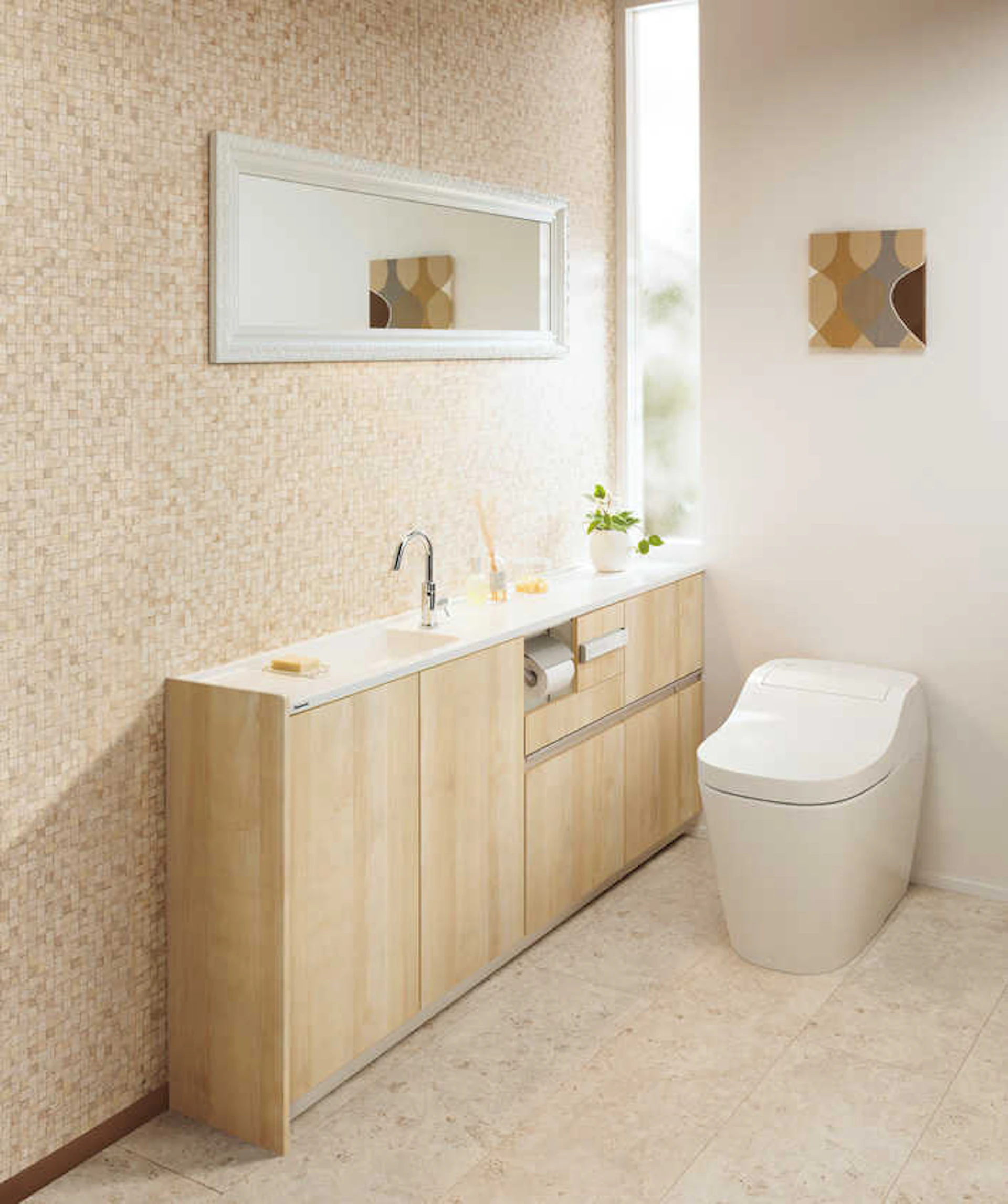 優しい色調で、明るい雰囲気がトイレの居心地を良くしています。