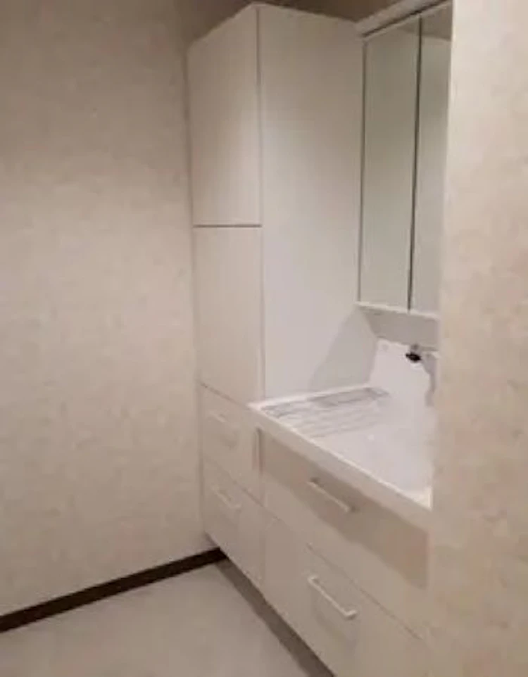 洋室の出っ張り部分を収納棚に変更し、収納力もある使い勝手のよい洗面台に仕上がっています。