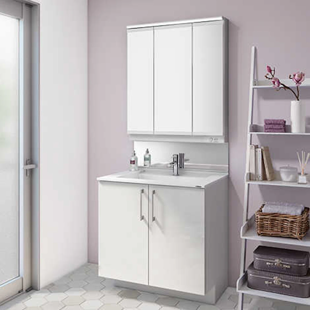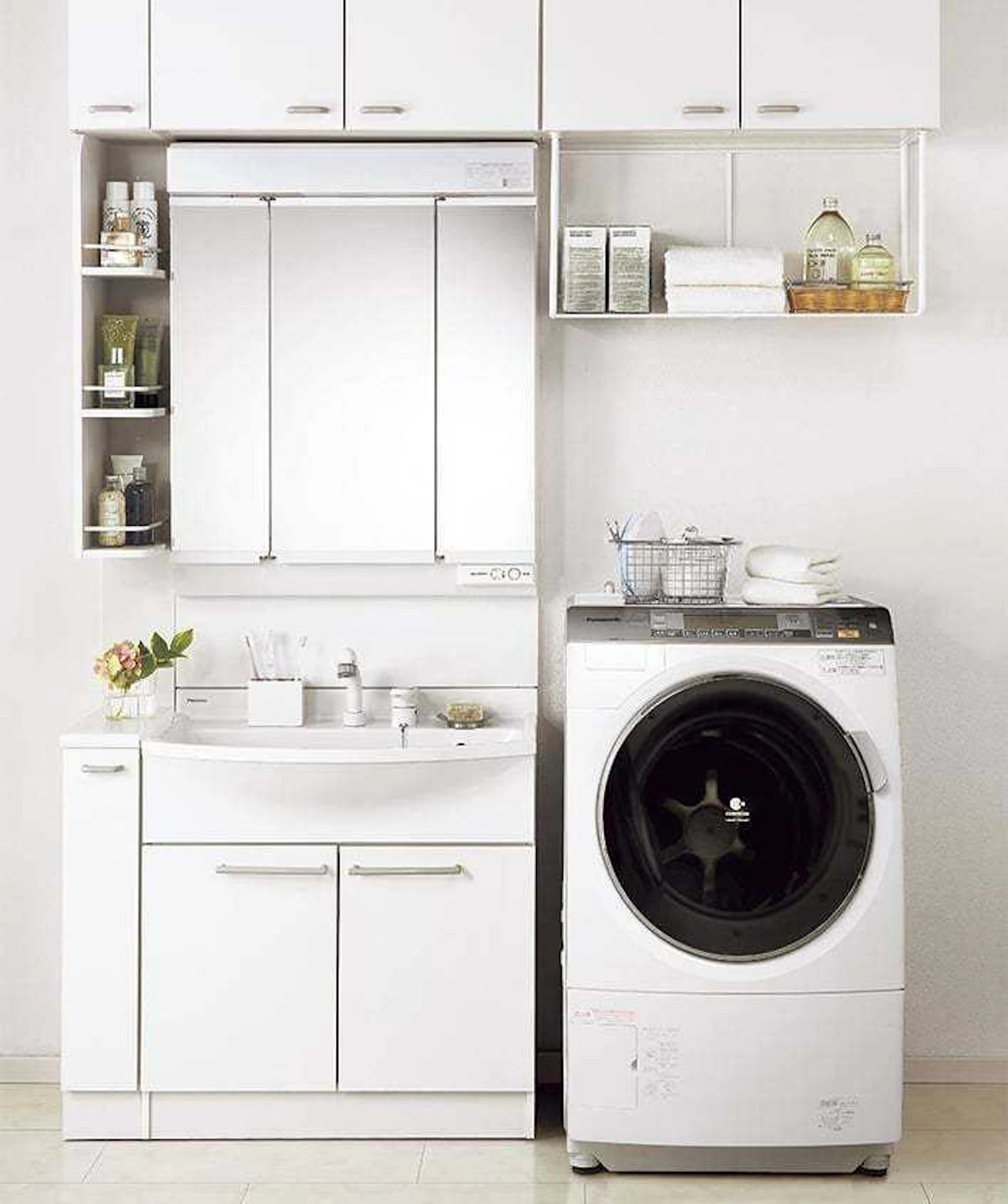 洗濯機との隙間を活用できるトールキャビネットや、アレンジ可能な三面鏡内のトレイなど、収納スペースも充実しています。