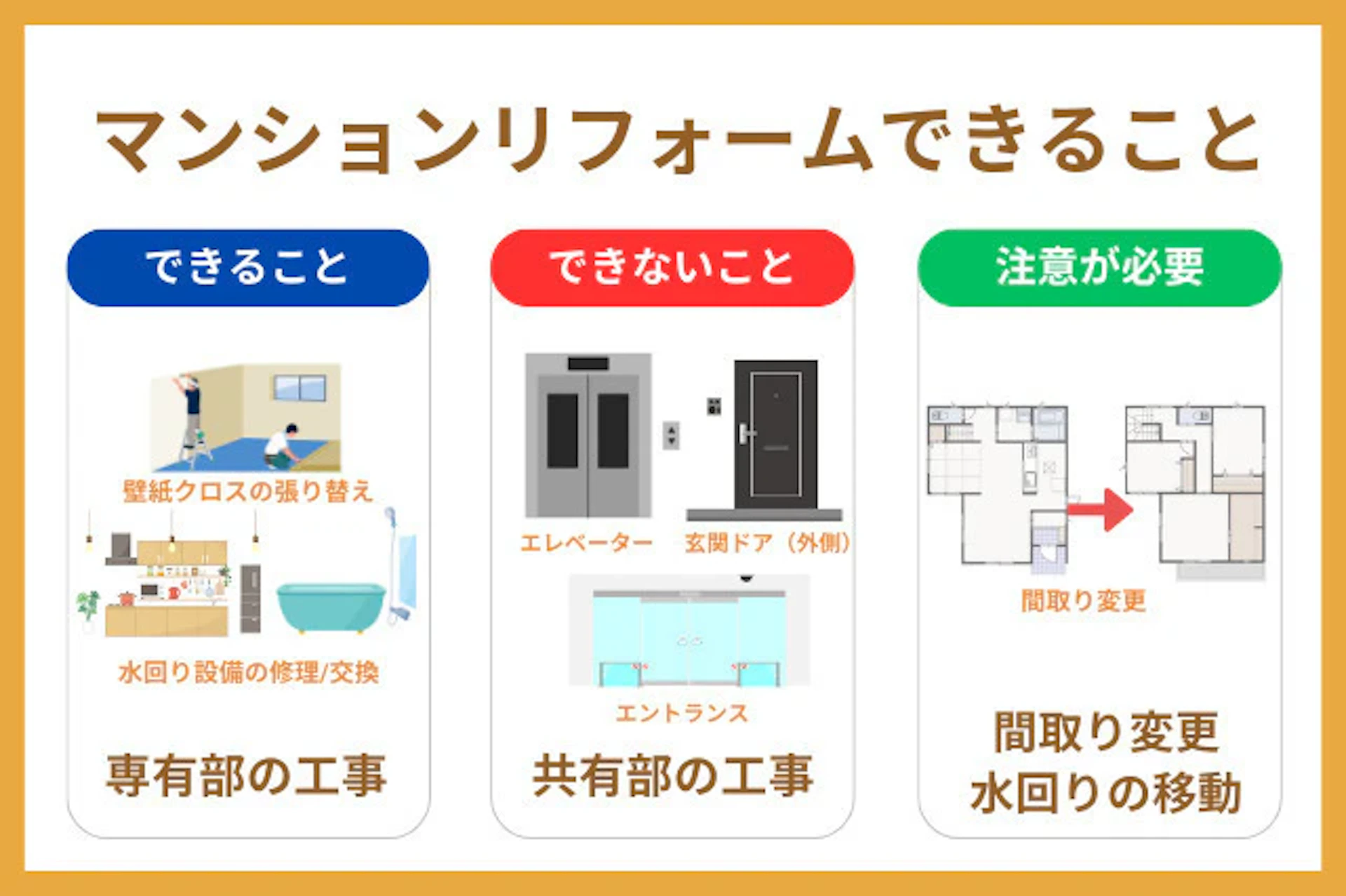 マンションリフォームは戸建リフォームよりも工事の制限が多く、管理規約によってリフォームできない箇所や施工上の注意点が定められています。