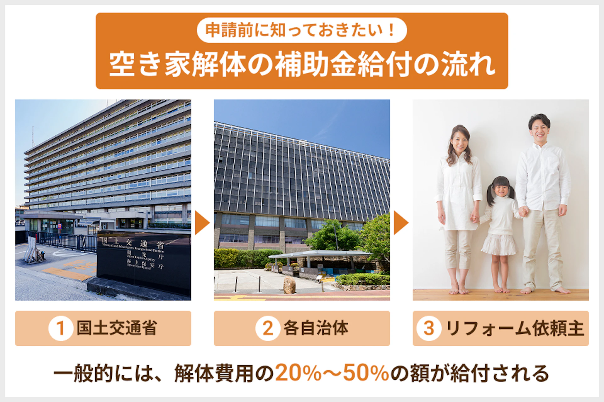 この事業により、国から各自治体に支援金の一部が支給され、個人が解体を行う際に各自治体から補助金が給付されるのです。