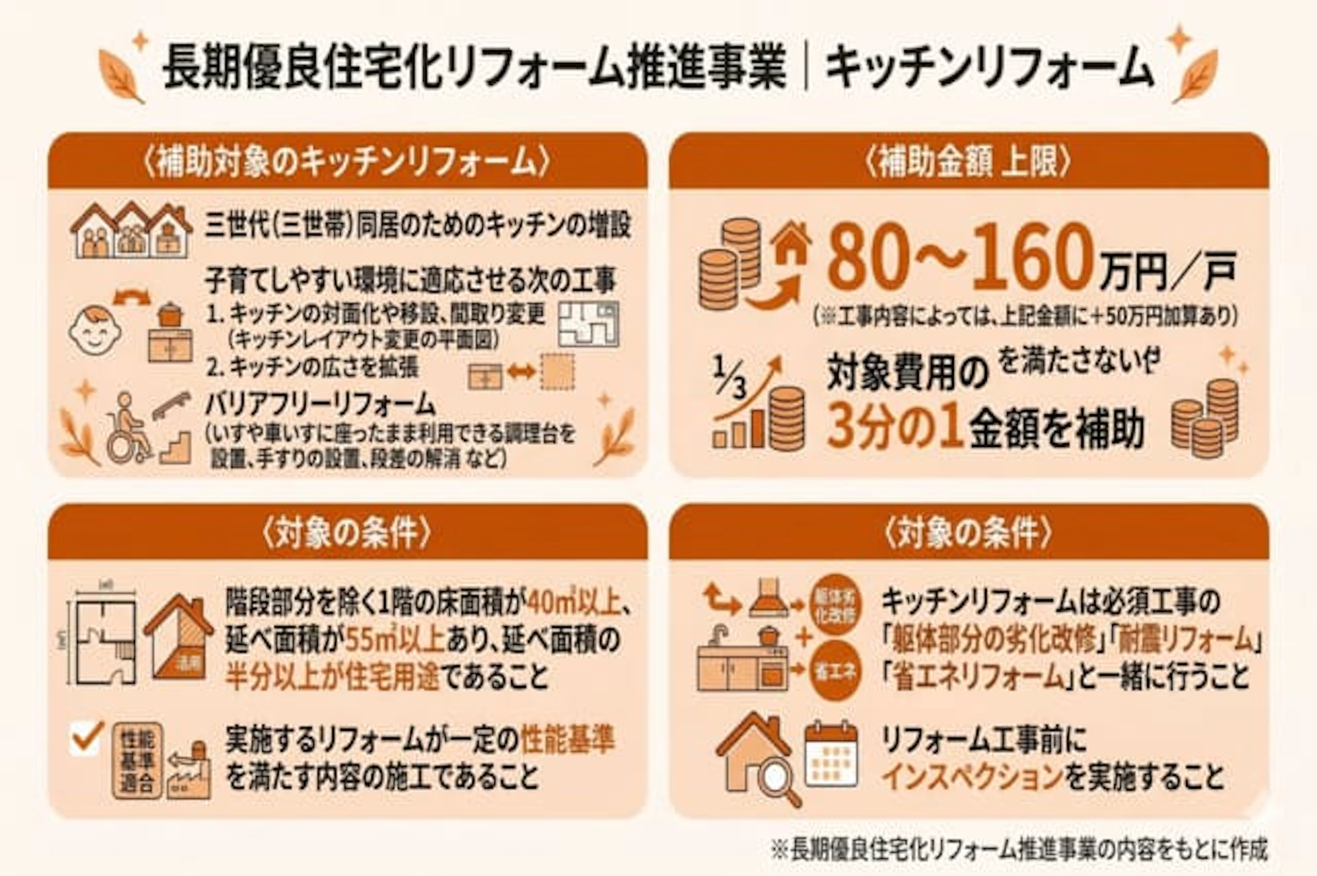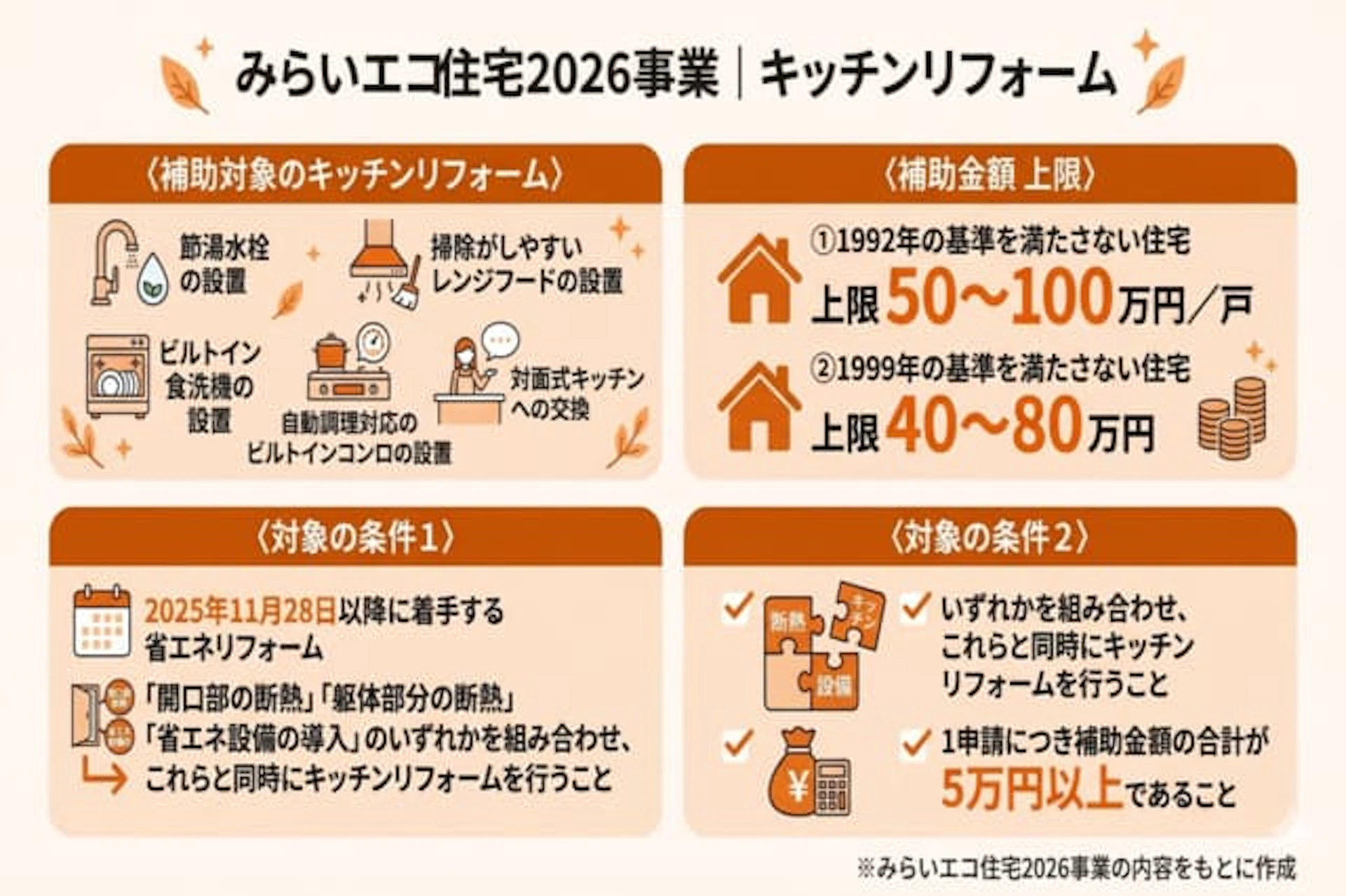 2026年3月現在、キッチンリフォームに利用できる主な補助金制度は次の通りです。