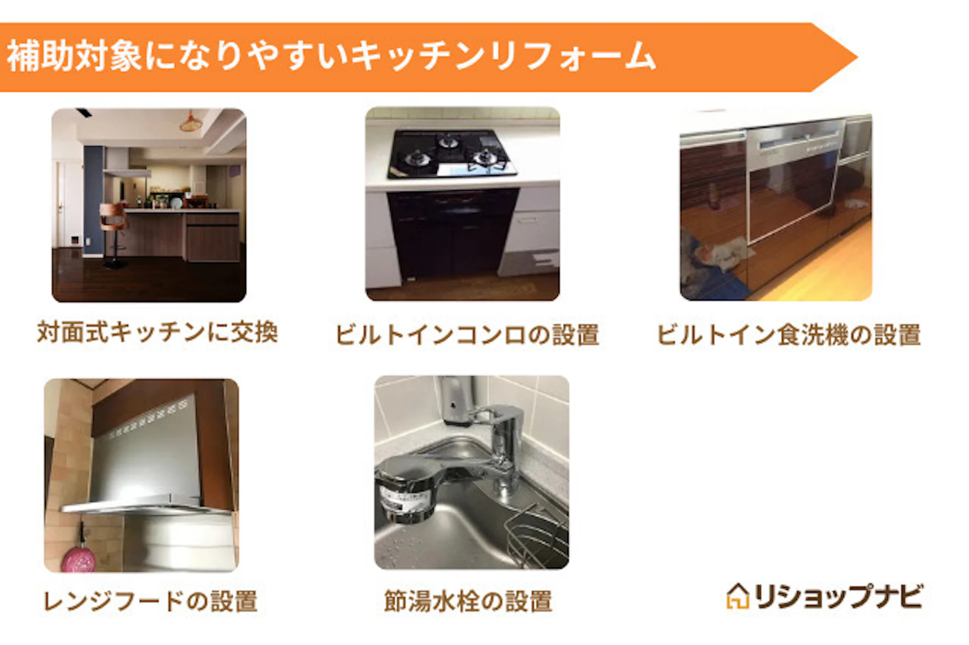 例えば、対面キッチンへの交換やシンクへの節湯水栓を導入、三世代同居のためのキッチンの増設などは補助対象となりやすい工事です。