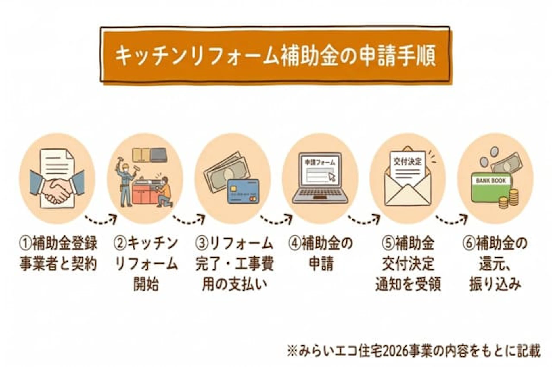 キッチンリフォームの補助金は、次の画像のように一定の手順に沿って申請を行う必要があります。
