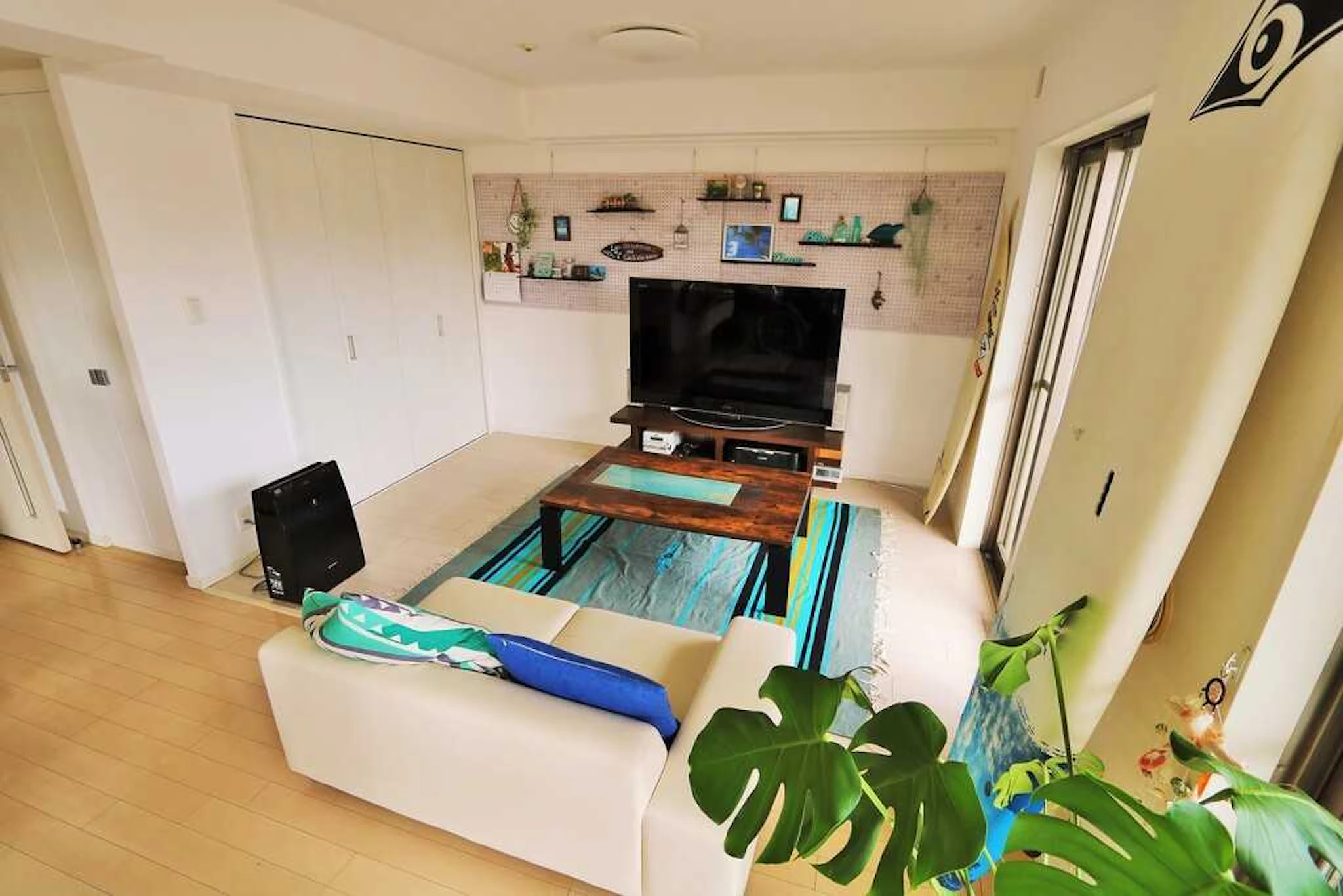 和室とリビングの境の壁をなくすことで、広々とした空間に仕上がりました。