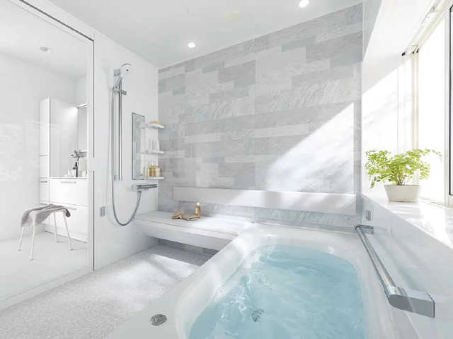 浴槽や小物もホワイト系で統一すると、まとまりのある浴室を作れます。
