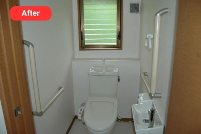 ②お母様の足腰が弱り介護が必要になったことを受け、屋外の汲み取りトイレから、屋内の物置スペースを利用した水洗トイレへの新設を行いました。