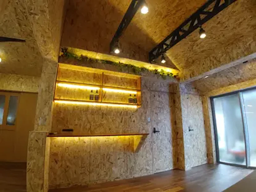 「古い建物をリフォームするので、せっかくなら変わったデザインにして欲しい」とのご要望があり、OSB合板を仕上げ材としたり間接照明も設置したりすることで、おしゃれに仕上げています。