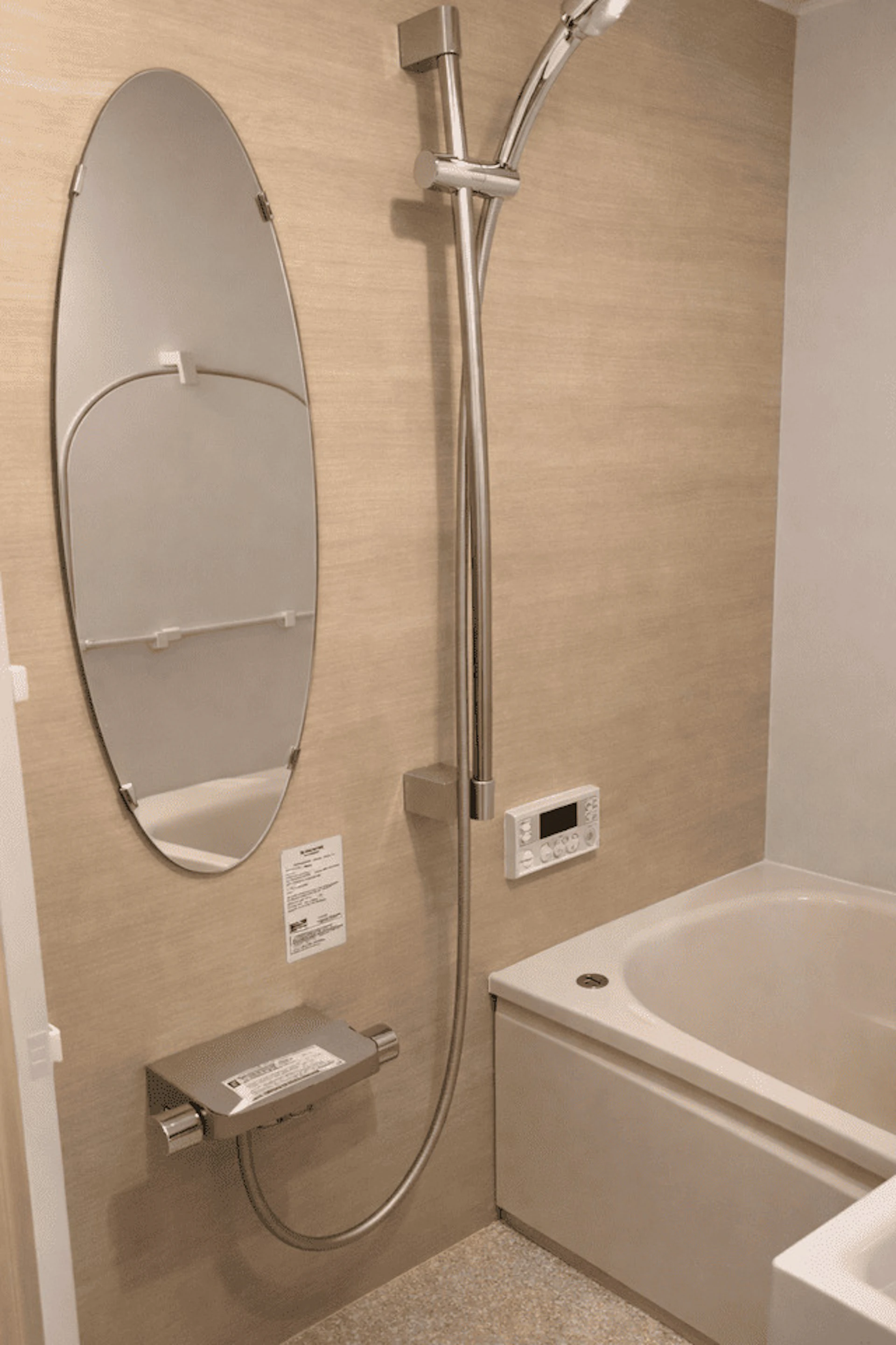 浴室の鏡は、珍しい楕円形のものを採用し、海外のお風呂のようなおしゃれな空間を演出しています。