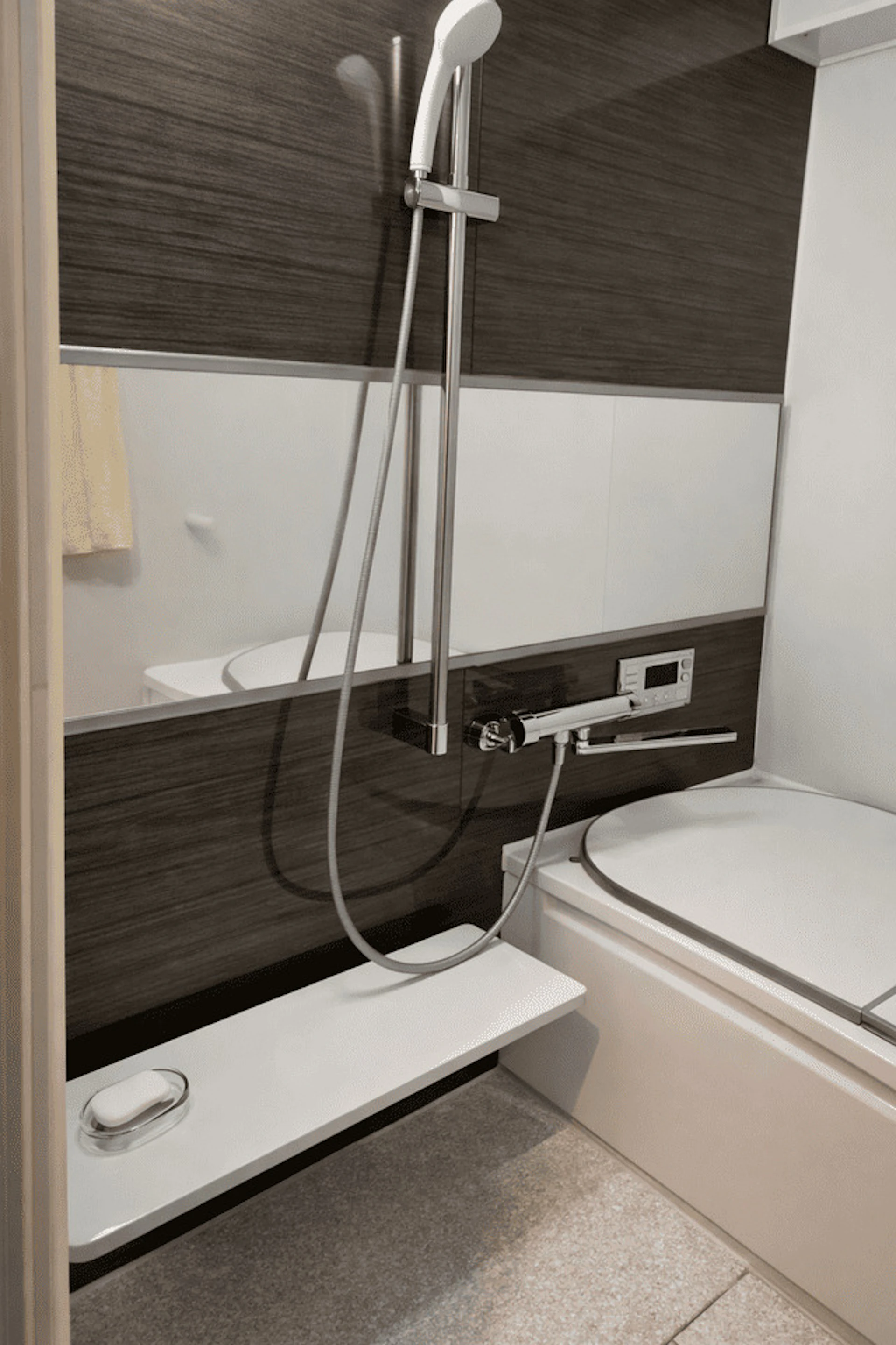 白で統一した浴槽や床とは対照的なブラウンのパネルを取付、アクセントがおしゃれな浴室に仕上げています。