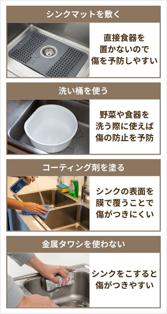 シンクの傷を予防したい場合は、シンクマットや洗い桶を使ったり、コーティング剤を塗ったりしてください。