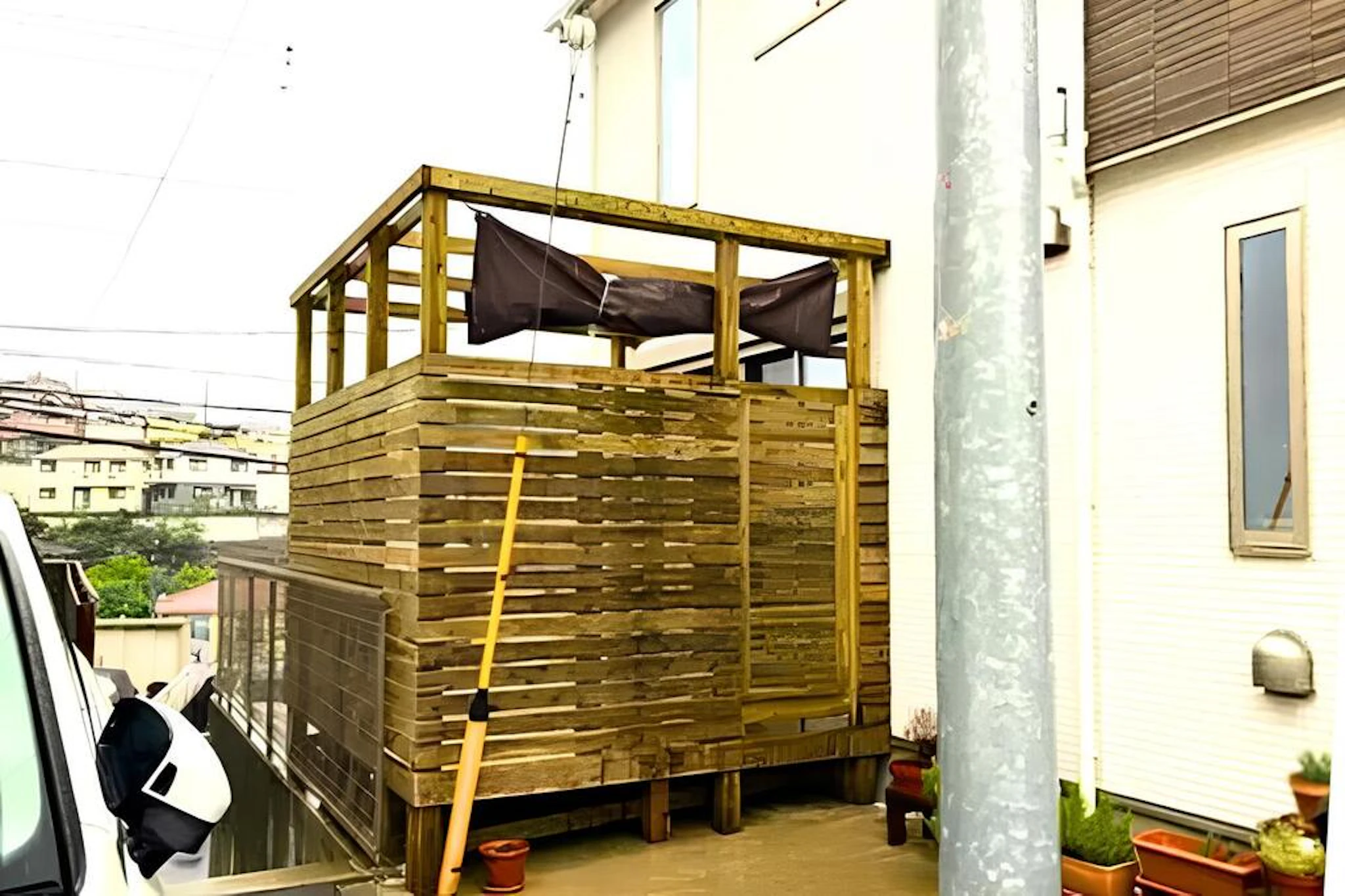 よりプライバシーを守れる空間にするなら、ウッドデッキ全体を高いフェンスとパーゴラ屋根で囲ってみてはいかがでしょうか。