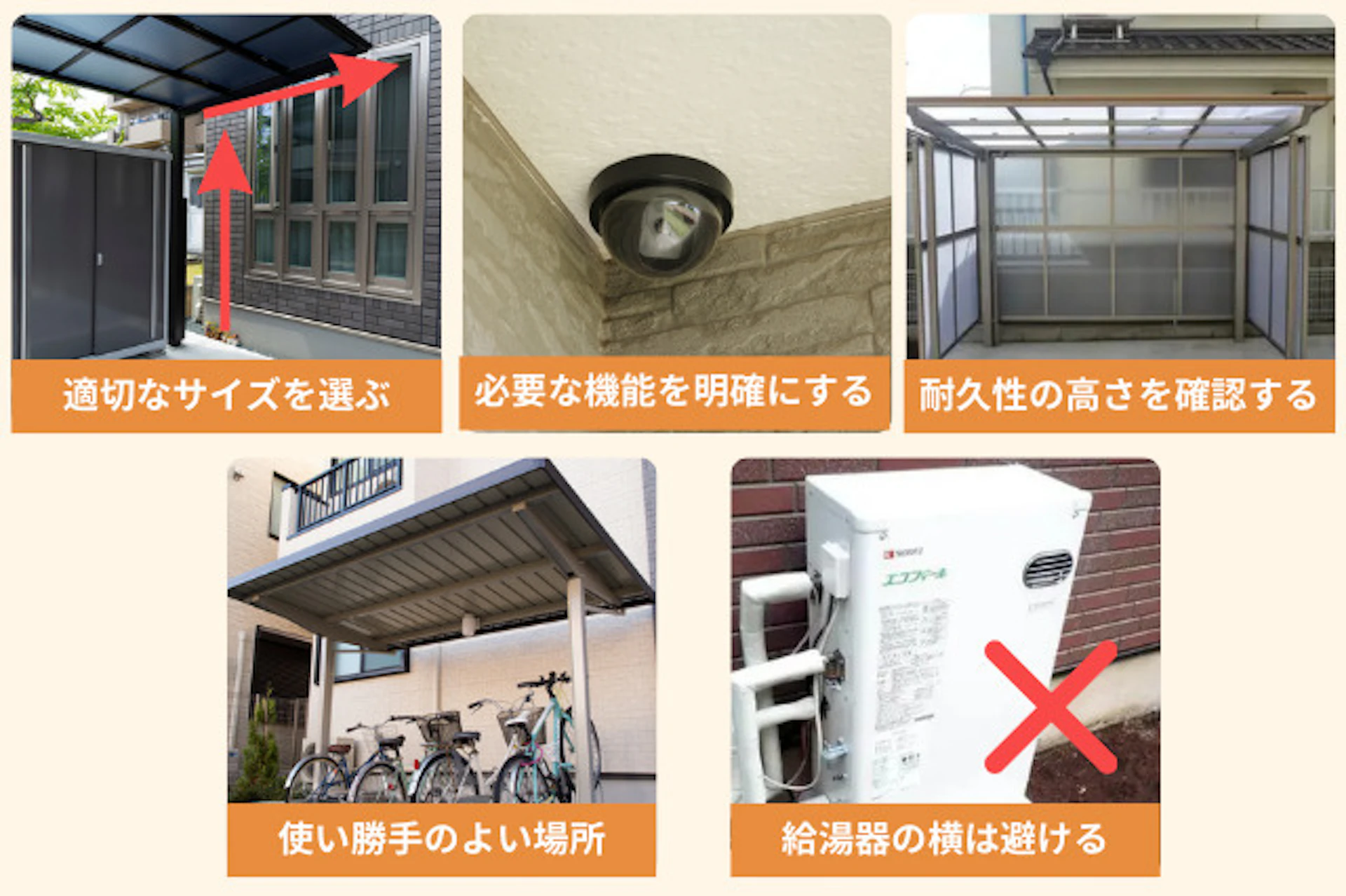 サイクルポートの設置場所を決める際には、給湯器や暖房機器の近くは避けましょう。