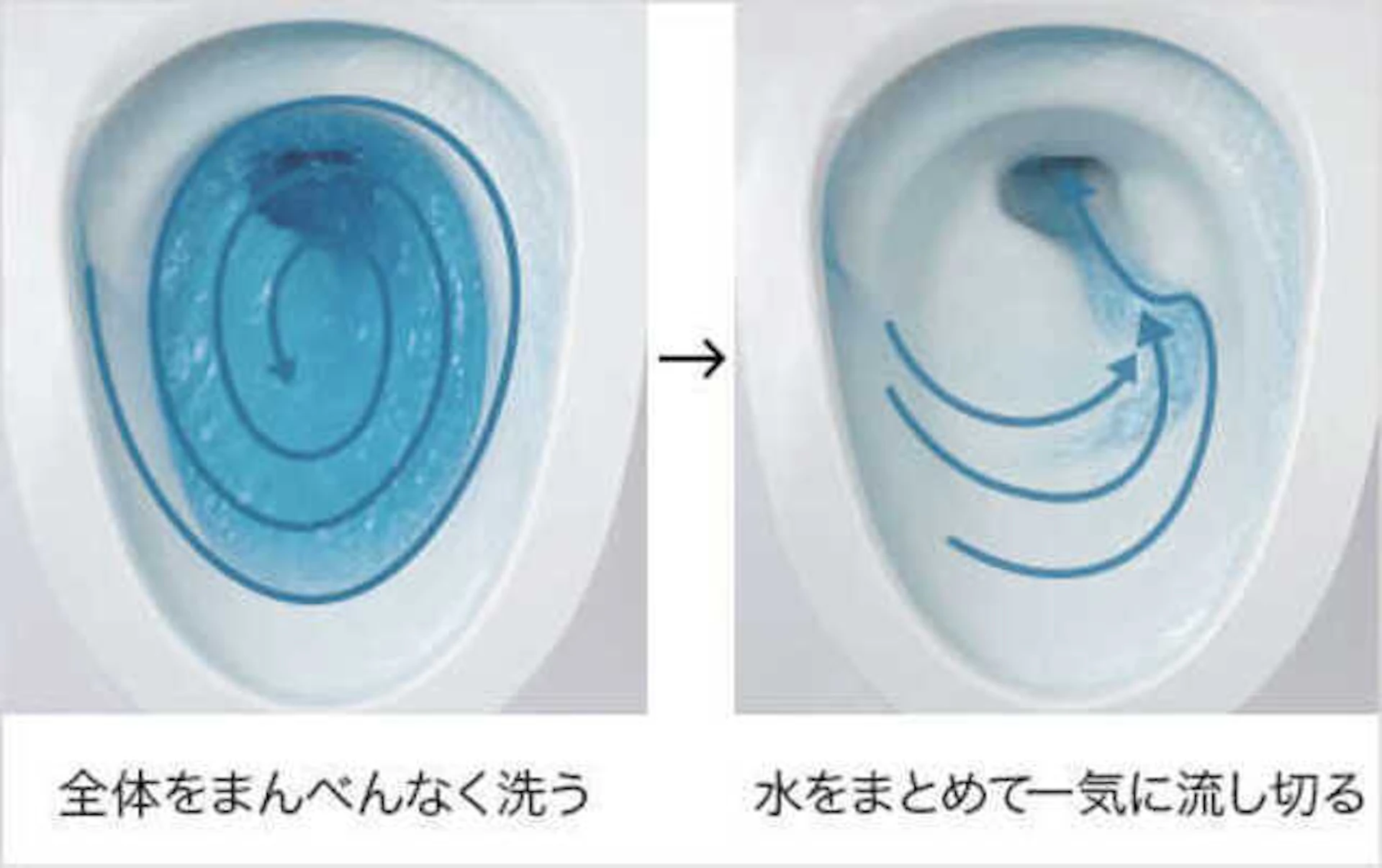 便器ボウルの排水口に斜めラインの谷間を設計したことにより、少ない水流でも一気に流すことを可能にしたのです。