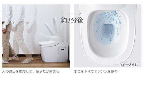 除菌に効果のあるオゾン水を便器内に散布し、汚れの元となる原因菌の発生を抑制する機能です。