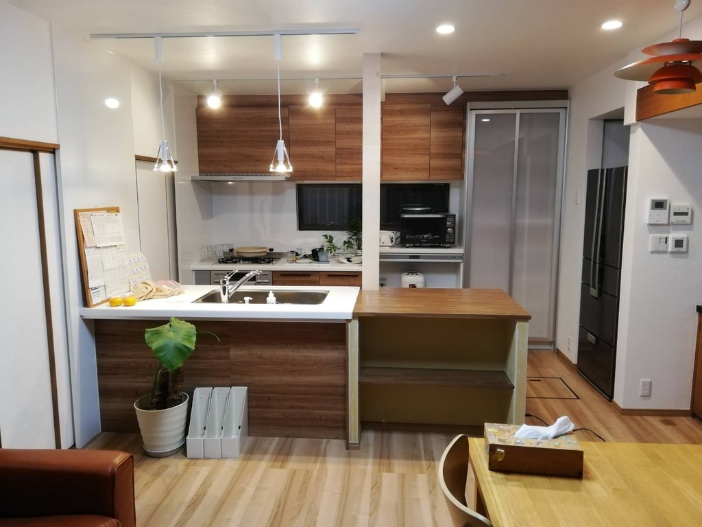 既存の吊り戸棚を撤去して開放感を出し、ご家族との会話も楽しめる台所になりました。