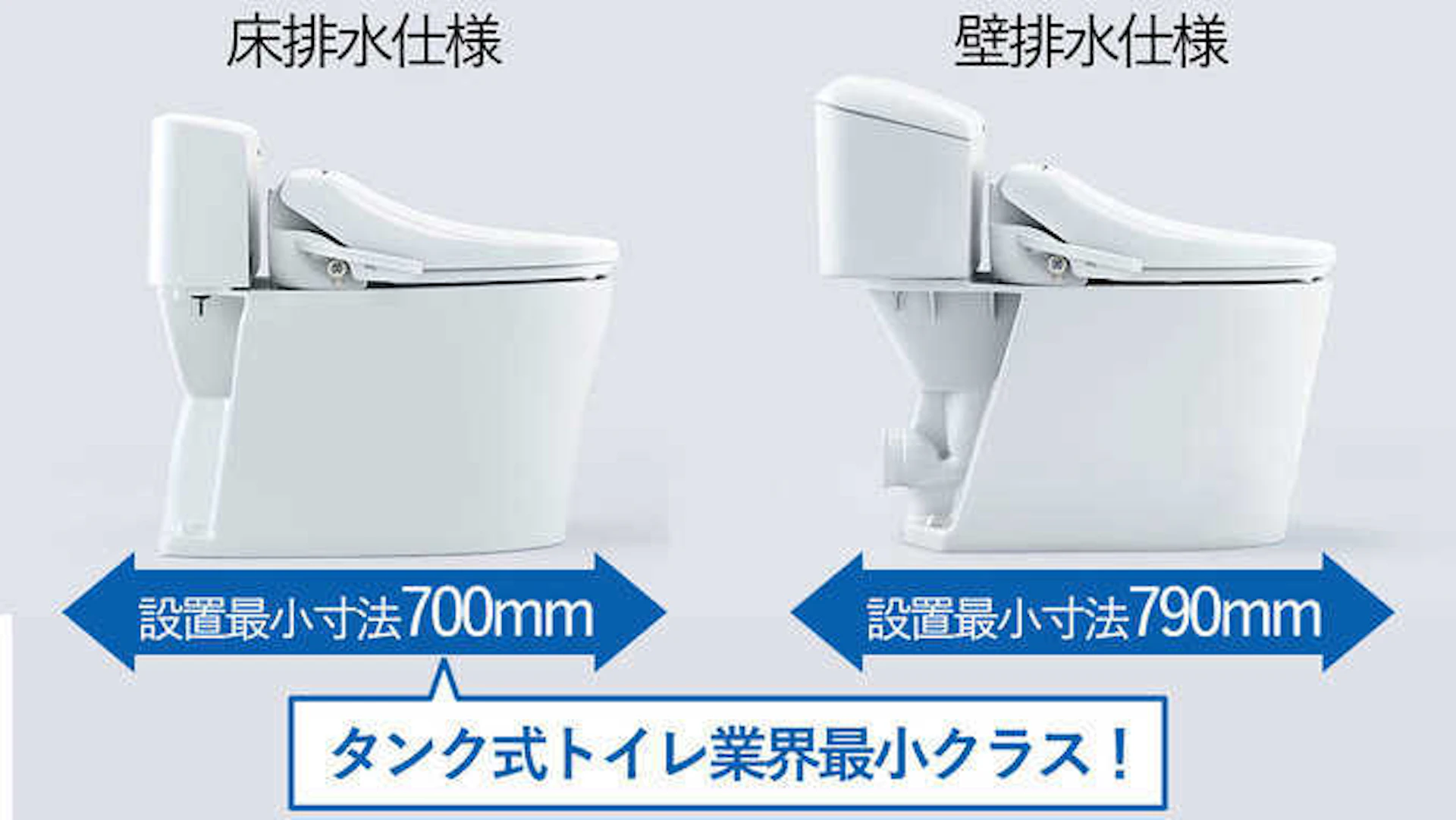 タンク式トイレにも関わらず、奥行きが700mm(床排水の場合)と非常にコンパクトなので、狭いトイレルームや集合住宅のリフォームにも適しています。