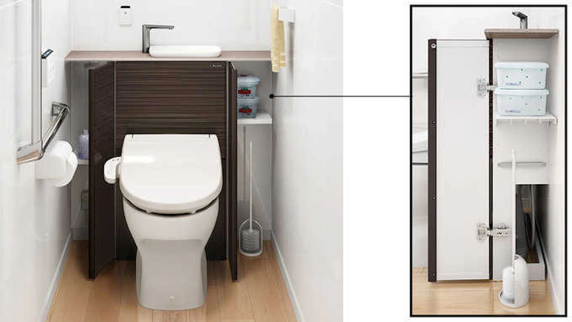 キャビネットの両サイドには、掃除用具やトイレットペーパーなどが収納できるようになっています。