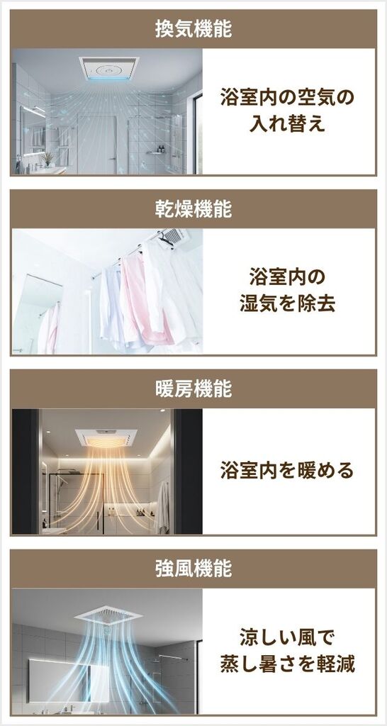 浴室乾燥機には、 換気、乾燥、暖房、涼風の4つの基本機能が搭載されています。
