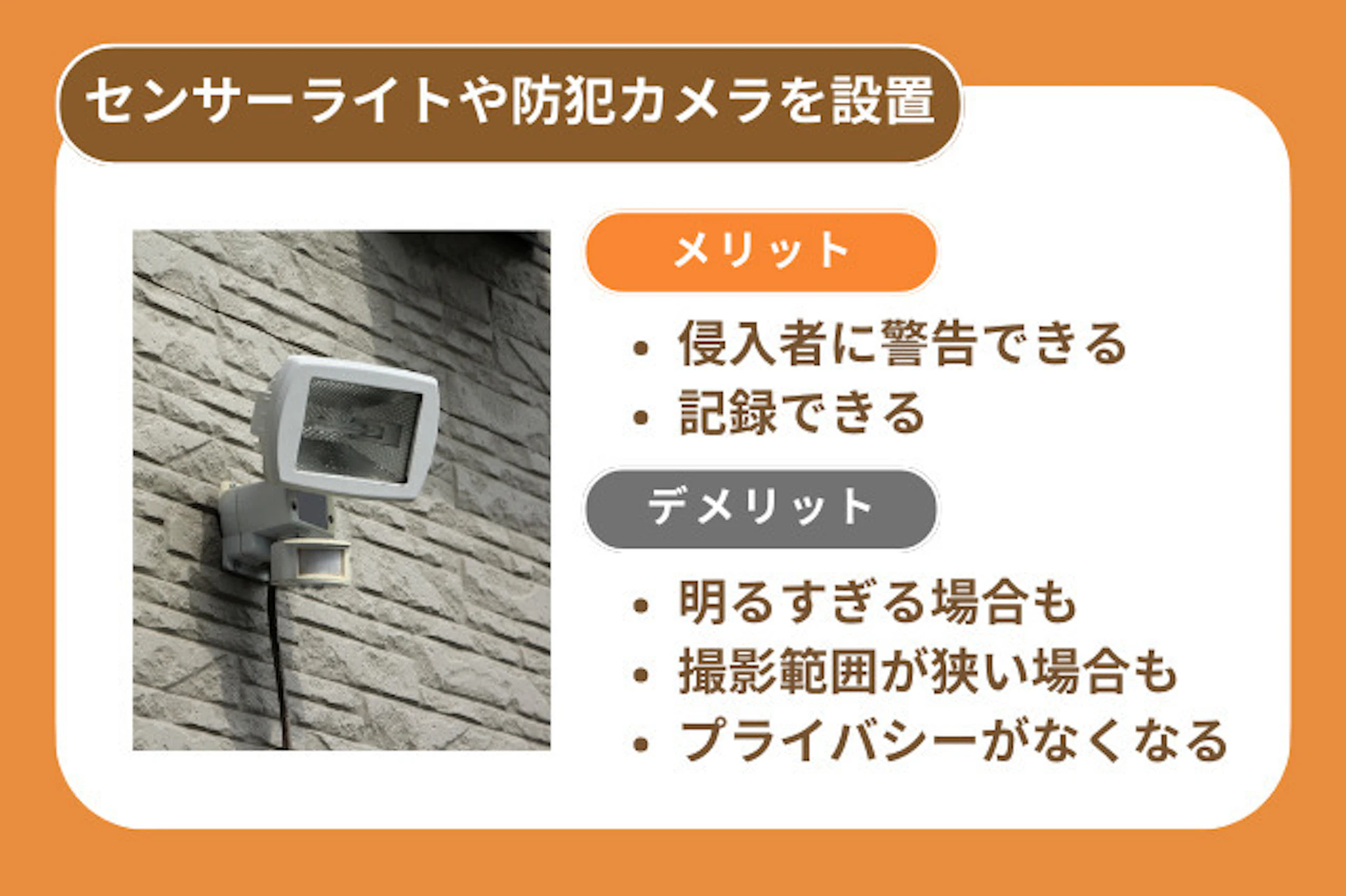 センサーライトのメリットは「この場所は目立つぞ」と侵入者に伝えられることです。
