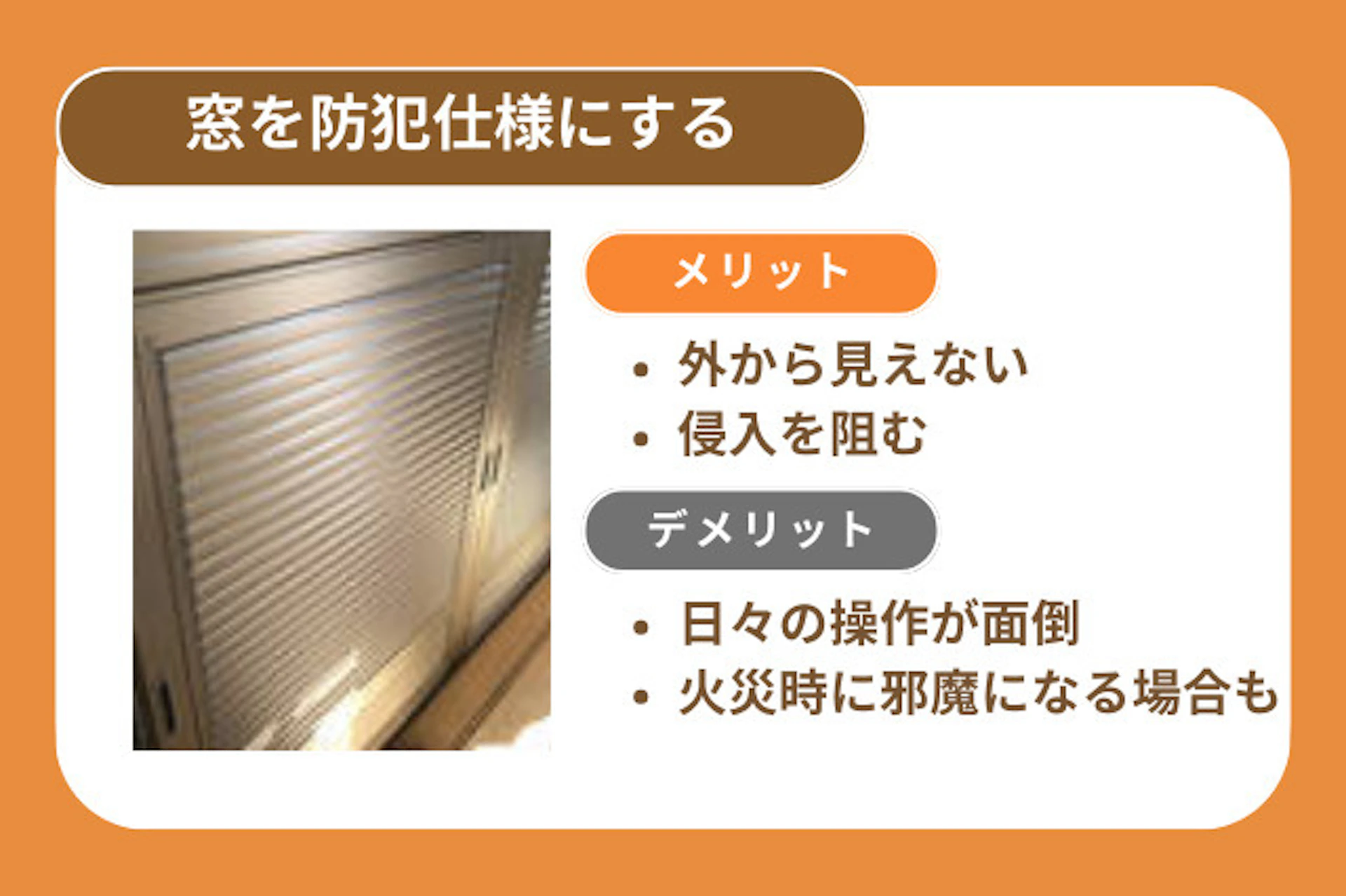 デメリットは、シャッターの場合だと上げ下げする手間がかかること、面格子だと火災時に邪魔になって逃げられないおそれがあることです。