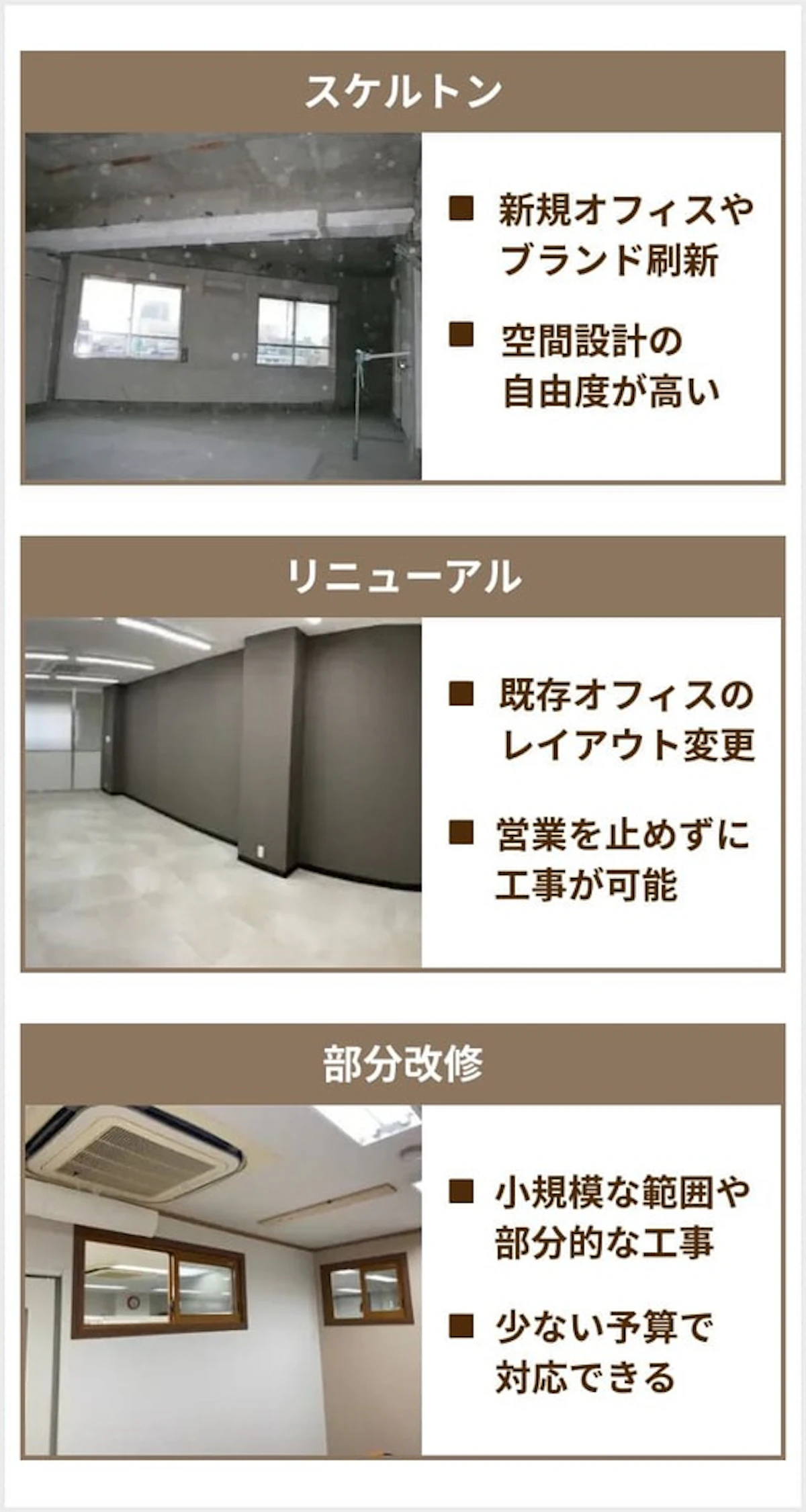 オフィス内装工事は、主に次の「スケルトン工事」「リニューアル工事」「部分改修」の3つのパターンに分けられます。