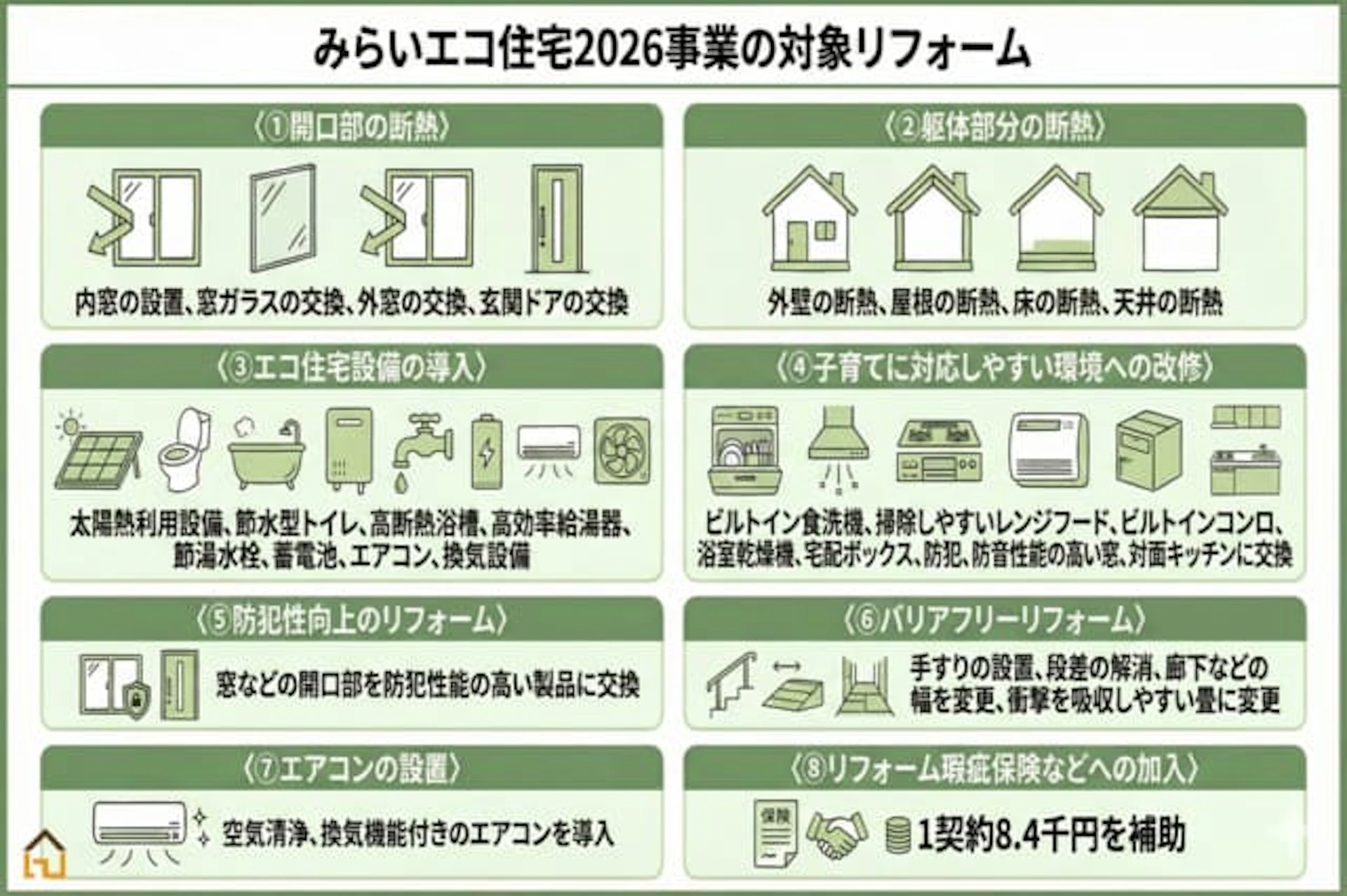 みらいエコ住宅2026事業の補助金対象となるリフォームは、次の通りです。