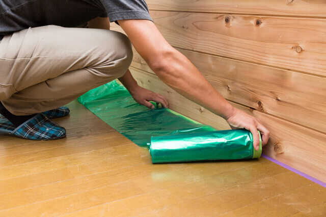 ![]() 珪藻土が余計な部分に付かないように、周囲を養生します。 壁の巾木(はばき)やコンセント・スイッチなどにはマスキングテープを、床にはマスカー(テープ付き養生シート)を使いましょう。 |