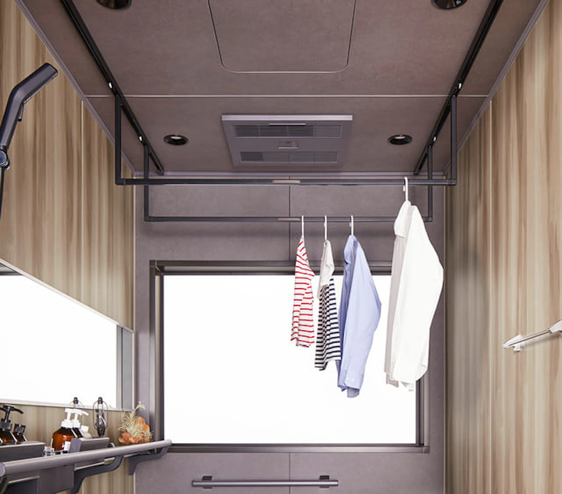 使い勝手のよい可動式の物干しバーである「乾動!優レールハンガー」と多機能な浴室用換気扇である「乾爽!除湿ファン」もセレヴィアの魅力のひとつです。