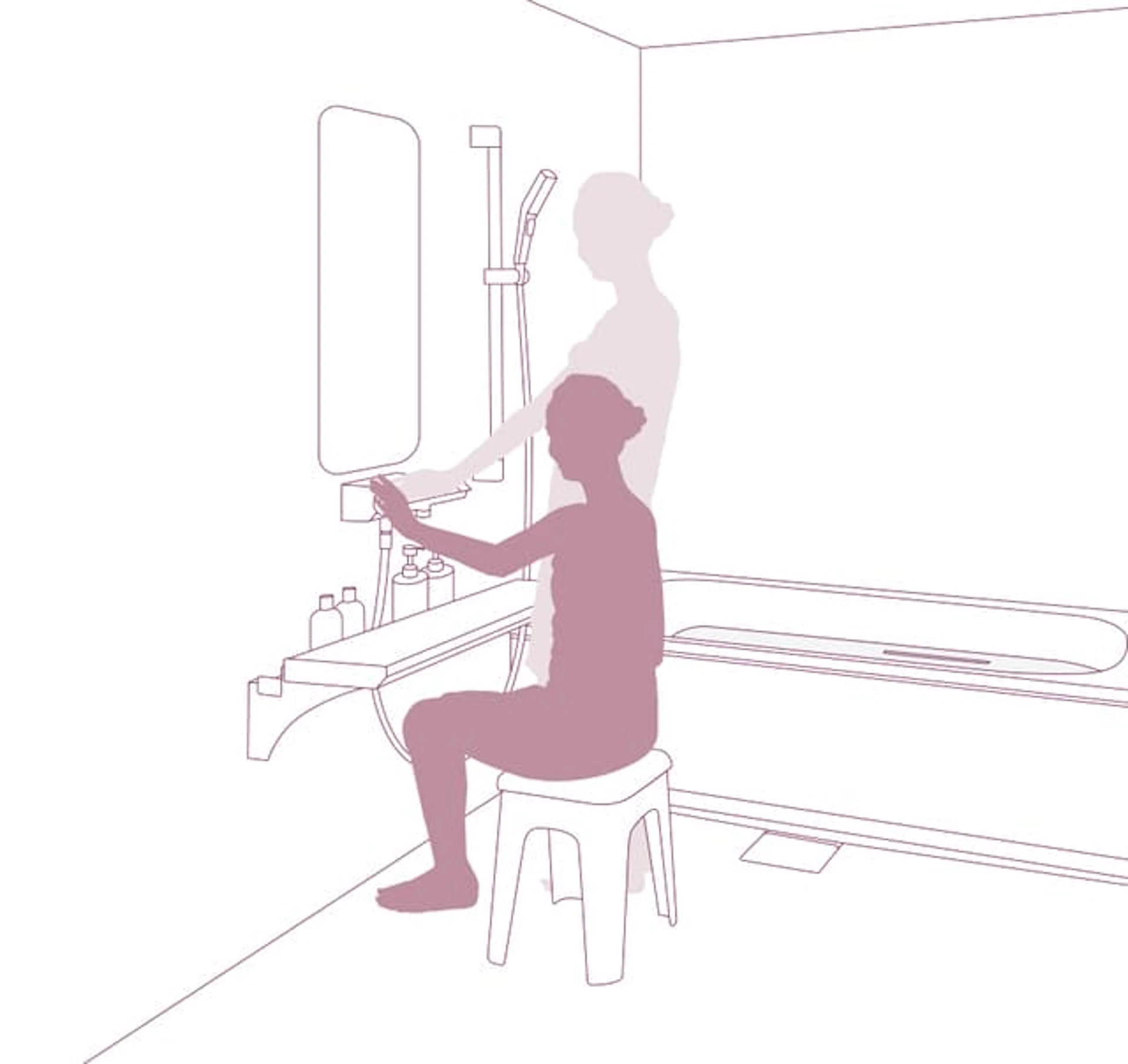 また、立ったまま・座ったままでも、水栓やボトルなどにも手が届きやすく、利便性の高い浴室設計となっているのです。