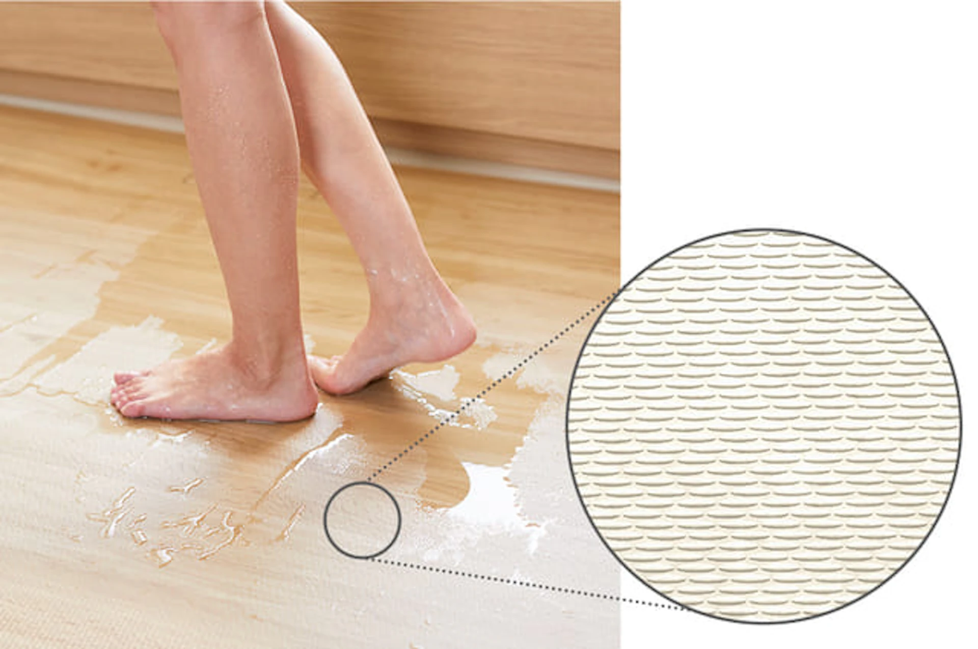 クリナップ独自のフロア素材と細かな凹凸によって、足裏を吸い付けて、足が滑りにくい仕組みになっています。