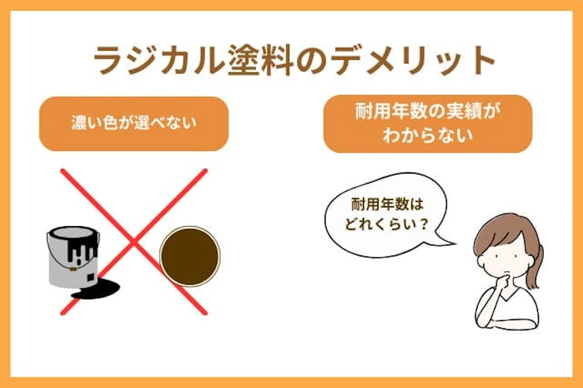 一方で「濃い色にできない場合がある」「歴史が浅いため、耐用年数の実績が現時点ではわからない」といったデメリットがあります。- ラジカル塗料の値段や耐用年数は、シリコン塗料と比べて、どの程度の差がある?