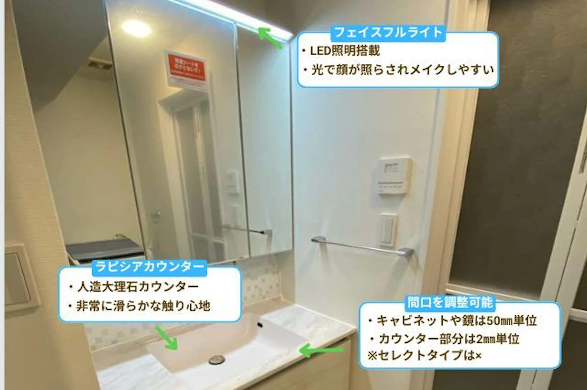 キャビネットやミラーは50mm単位、カウンター部分は2mm単位でオーダー調整OK。