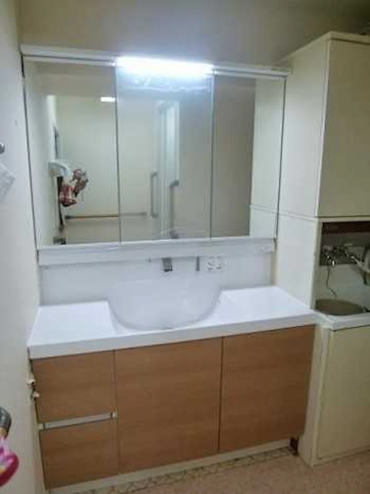 20年以上使用していた洗面化粧台から水漏れが発生したため、急遽交換リフォームを実施しました。L.C.には、「キレイアップ水栓」や水の飛び散りを防ぐ「ハイバックガード」など、お掃除を楽にするための機能が満載。20万円未満でリフォームすることができました。