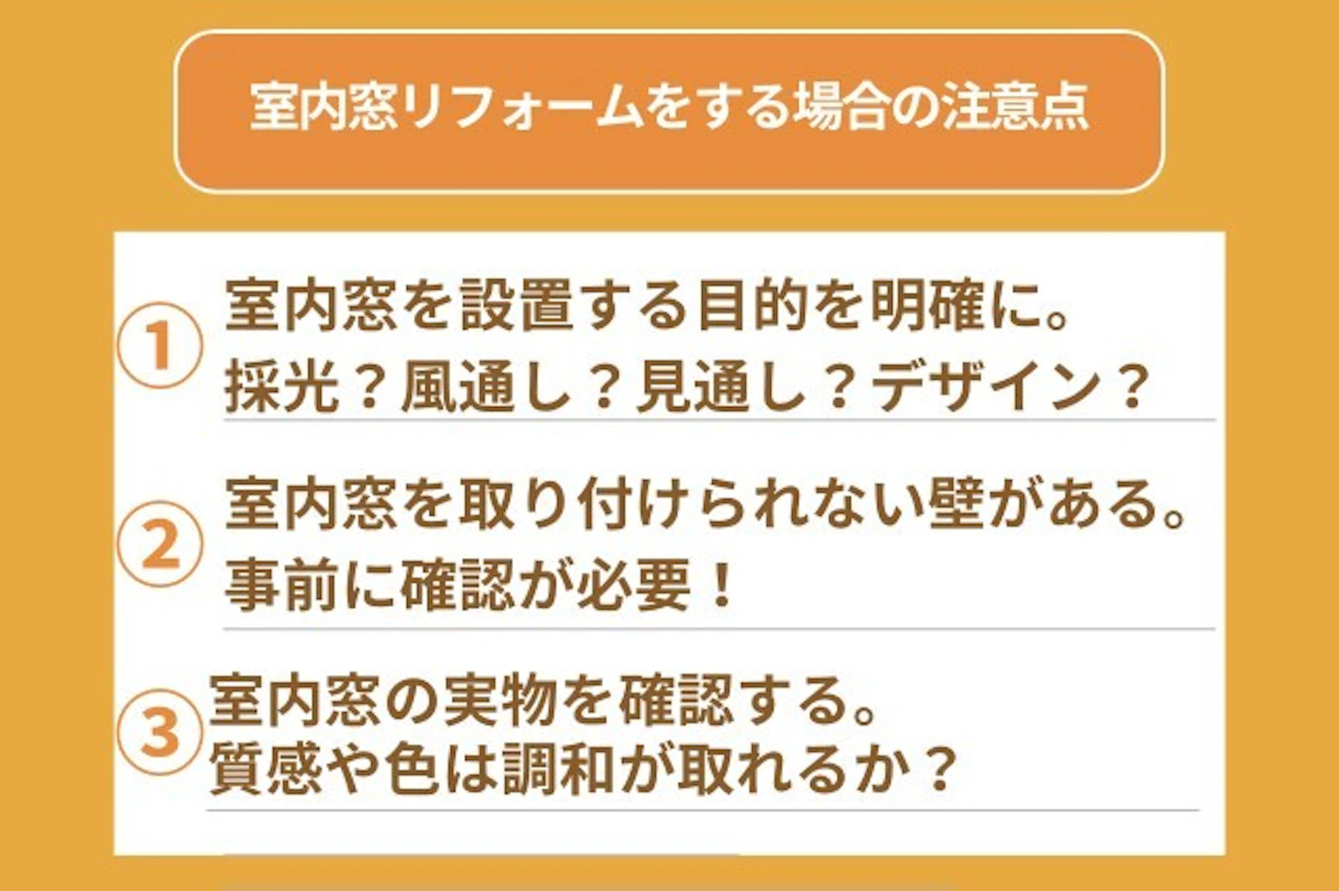 室内窓をリフォームする際に注意してもらいたい3点を、ご紹介します。