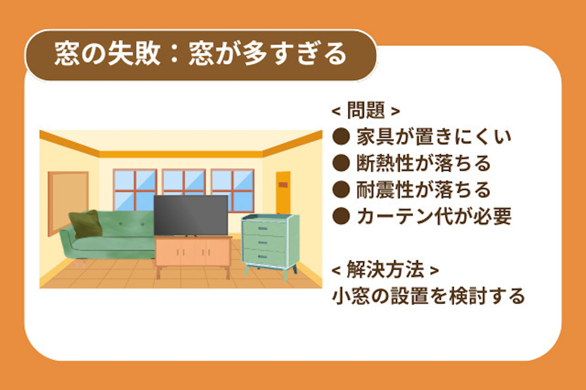窓を多く付けすぎて、家具を置く場所に困ったという失敗例もあります。