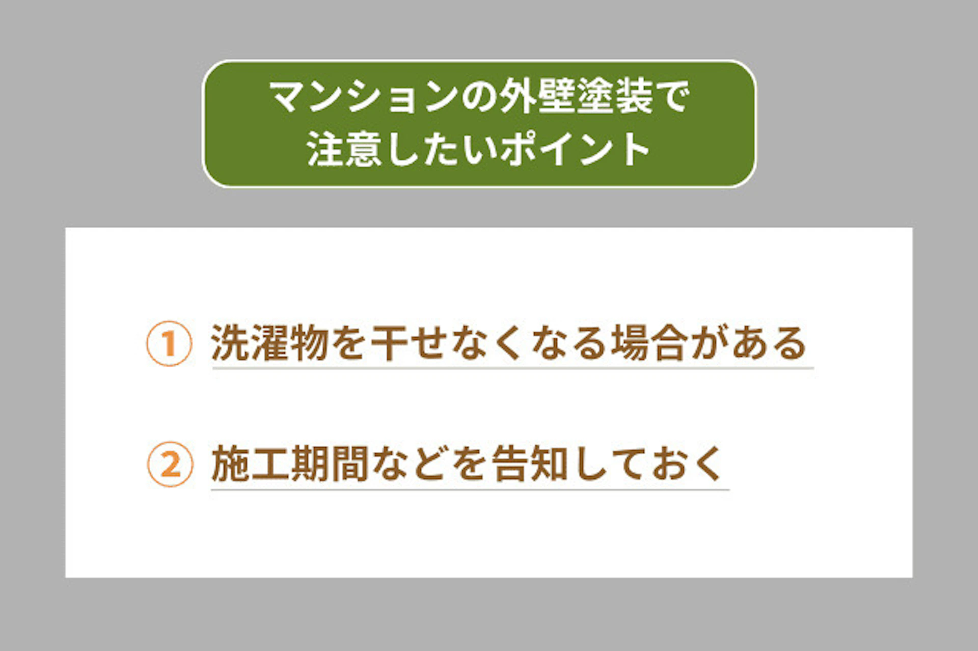 ベランダで洗濯物を干せない期間があるため、トラブル防止のためにも居住者や近隣住民に、余裕を持って告知しておくことが大切です。
