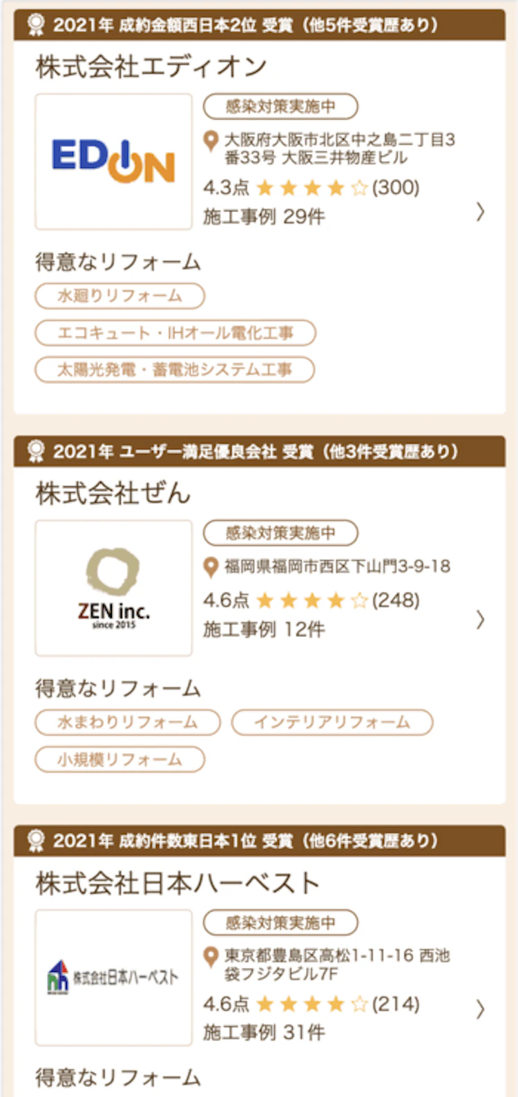 次の口コミは、いずれも「リショップナビアワード」受賞企業の内容ばかりです。