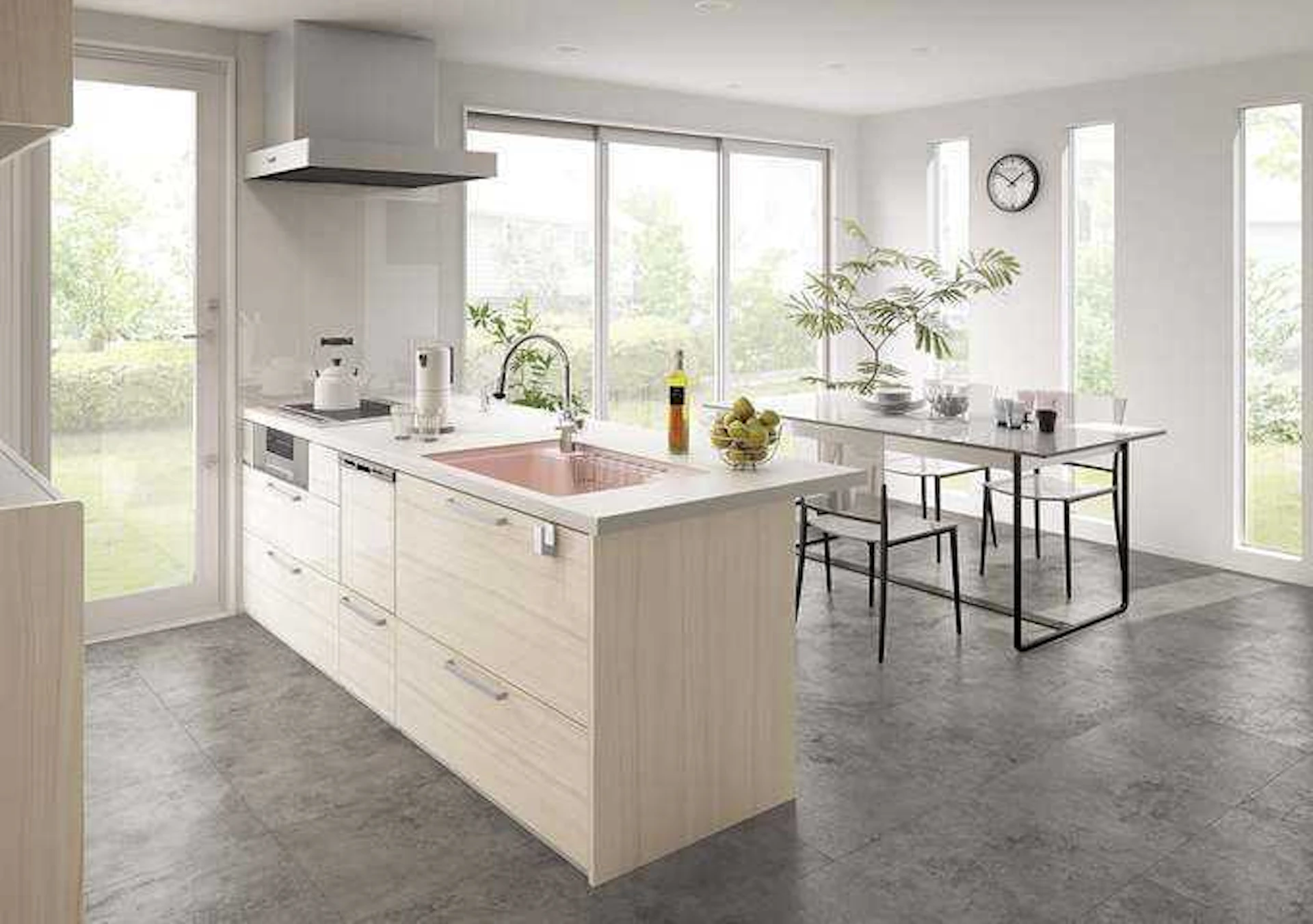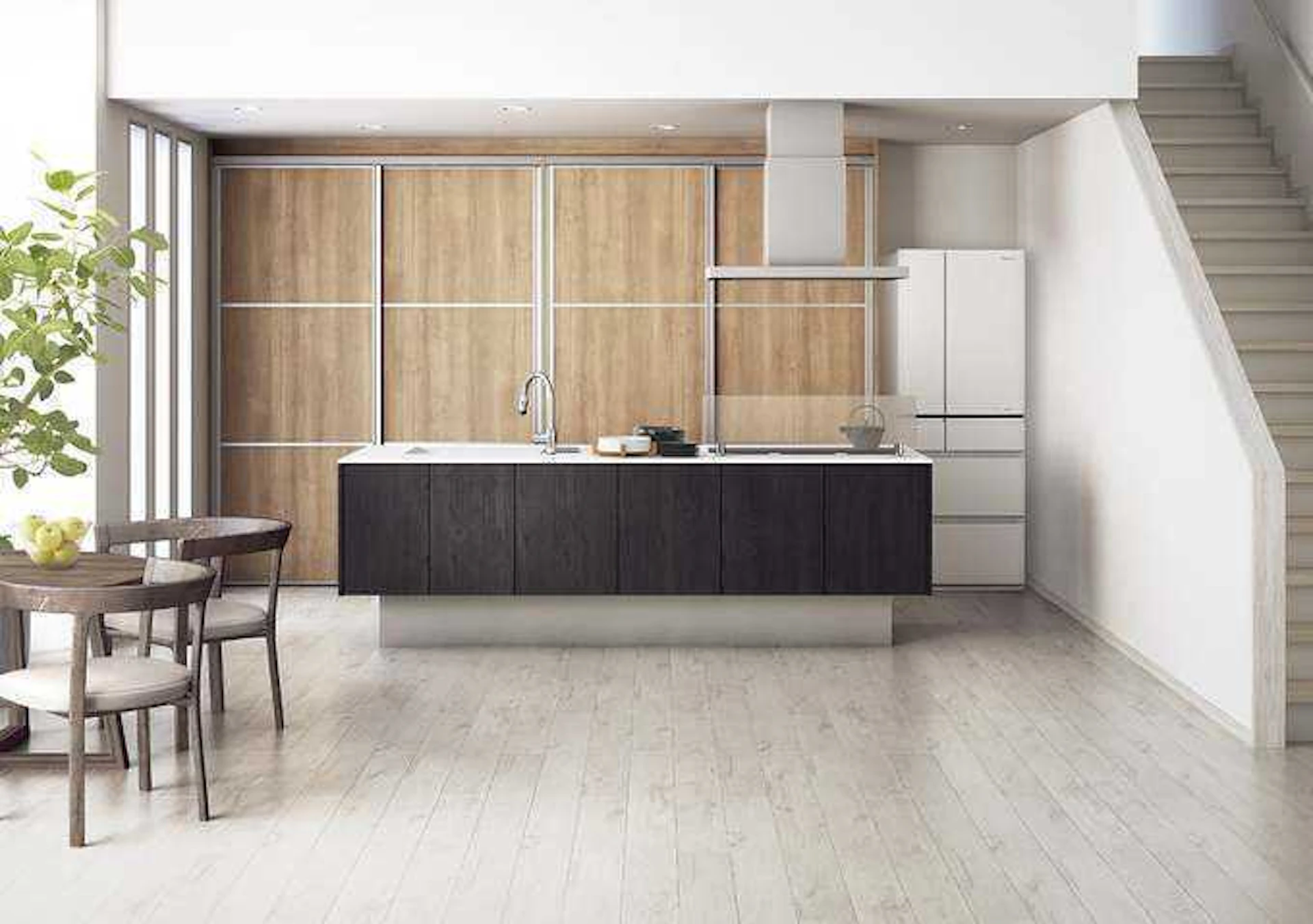 シンプルでスタンダードでありながらも、「スキマレスシンク」や 「トリプルワイドコンロ」など、使い勝手の良い収納や省エネ機能などはしっかりと備えた「リビングステーション Vスタイル」。