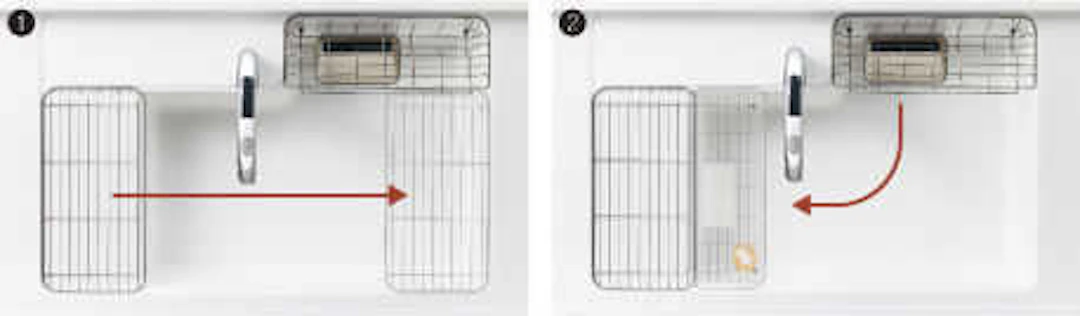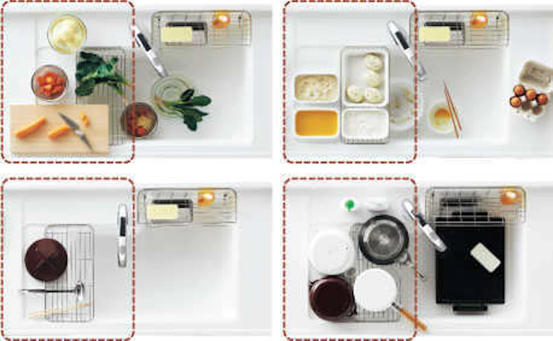 シンクの端から端まで動かせる「スライドネット」と、大きい鍋を洗うときなどにサイドデッキ横まで動かせる「マルチラック」のおかげで、用途に合わせて作業スペースを簡単に作れます。