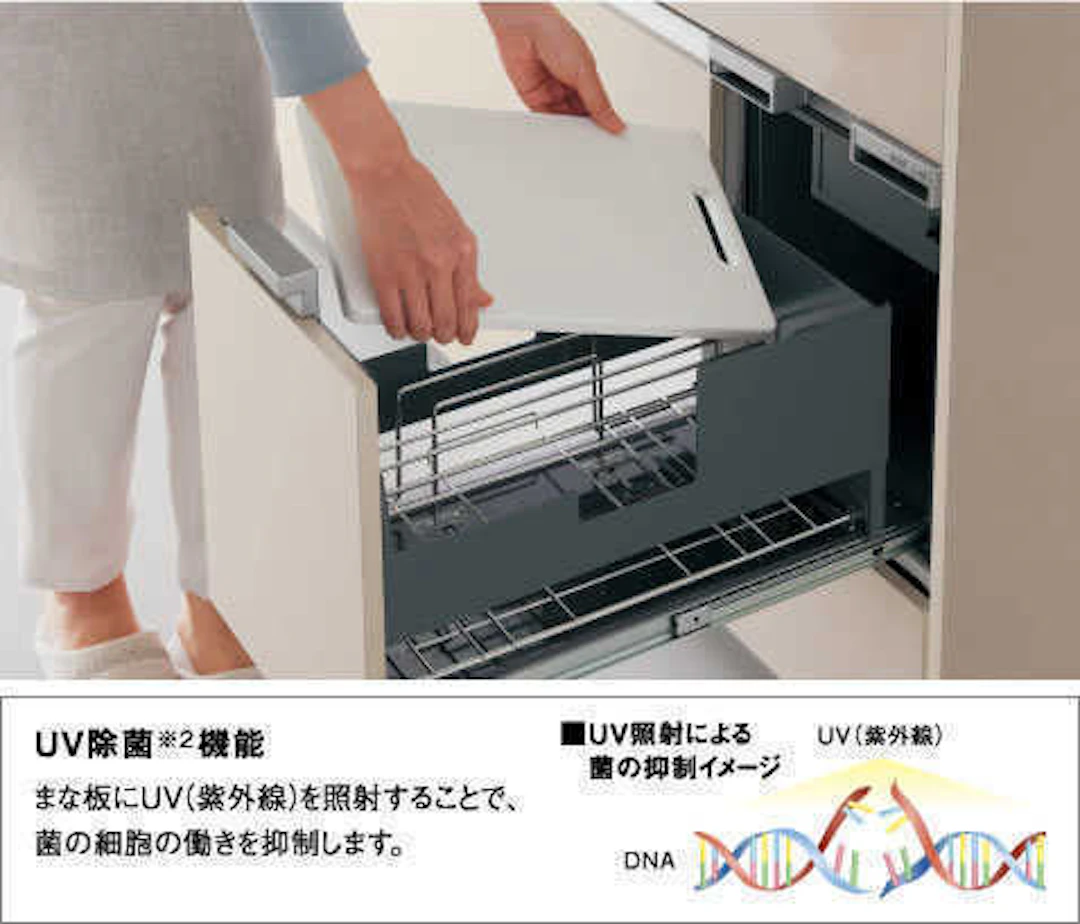 業界初のUVキセノンランプを使用しており、まな板の除菌がたった2分ほどで完了するので、調理の前にパッと済ませることもできてしまいます!