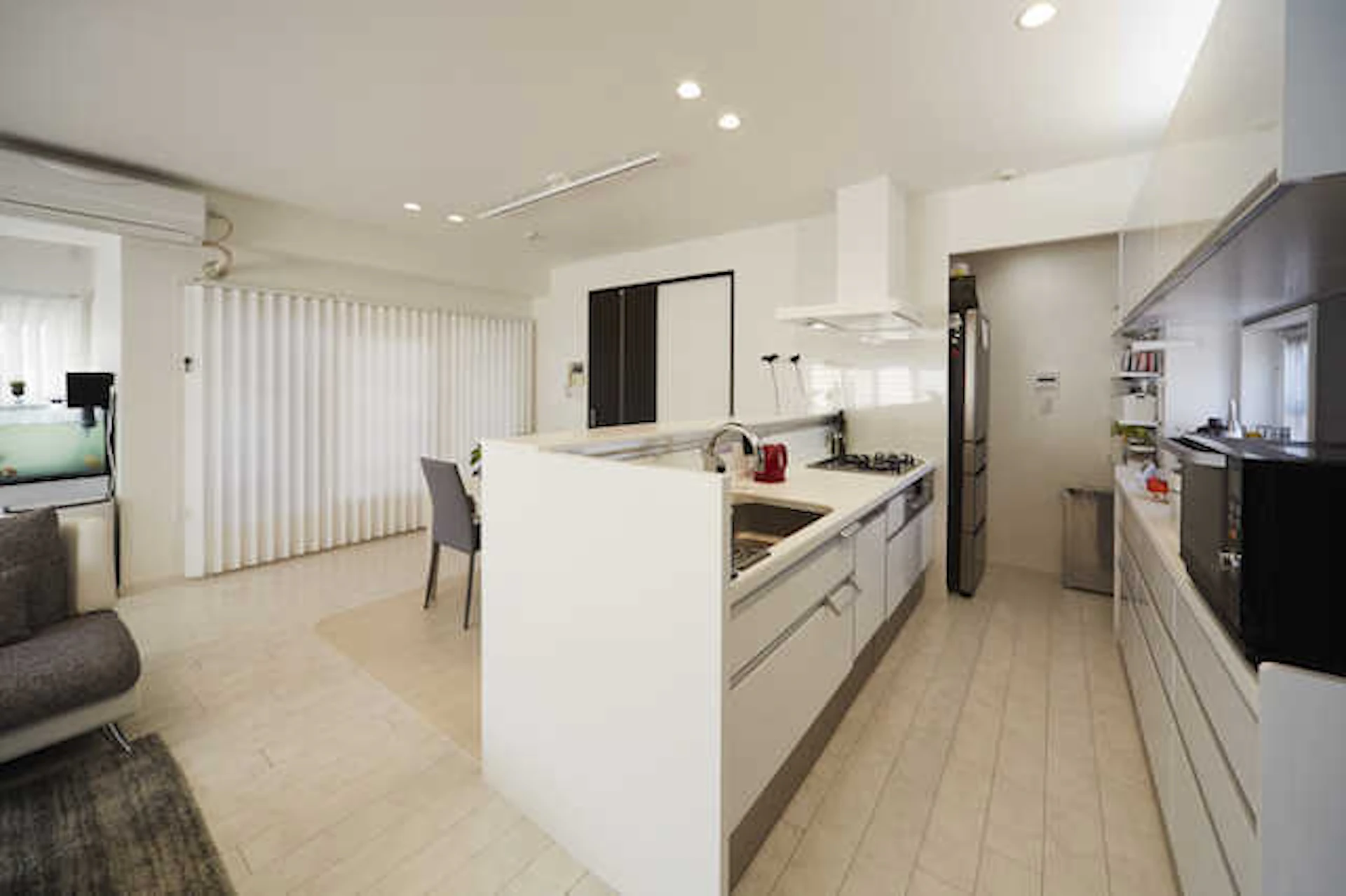 こちらもキッチン周りの壁を撤去して、開放感のあるオープンキッチンにリフォームしました。ダイニング側に立ち上がりカウンターがあるタイプを採用しているので、しっかりと手元を隠しながら料理をすることが可能です。内装との統一感もある、とてもおしゃれなLDKになりました。