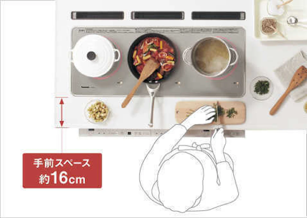 また、コンロ手前のスペースは16cmと広く、鍋からお皿にスムーズに盛り付けができます。